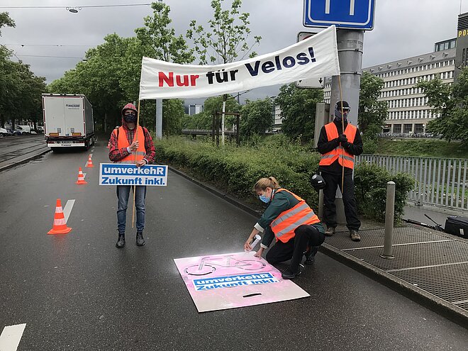 Bei den letzten Abstimmungen hat sich deutlich gezeigt: Die Bevölkerung wünscht sich ein bessere Veloinfrastruktur. Und gerade während der Coronakrise bewährt sich das Velo als geeignetes Fortbewegungsmittel. Viele Grossstädte haben mit Pop-up-Radwegen eine einfache und schnelle Massnahme ergriffen, um das Velo als Verkehrsmittel zu fördern. Nur in den Schweizer Städten hat sich bislang nichts getan. Deshalb haben Aktivistinnen und Aktivisten der Regionalgruppe Zürich von «Umverkehr» die Sache selbst in die Hand genommen. Sie fordern, dass in den Schweizer Städten flächendeckend Autofahrspuren in Velowege umgewandelt werden.