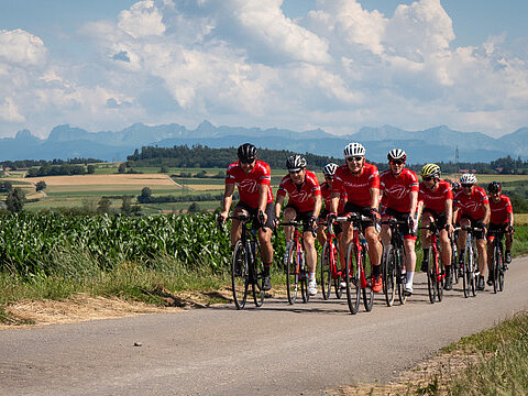 (Bild oben) 24 Stunden auf dem Rennrad: Diese Strapaze bewältigt man nur im Team – durch geschicktes Windschatten-Fahren, aber auch durch gegenseitiges Unterstützen bei Pannen, Müdigkeit und Motivationstief. (Foto: zwischen Kerzers und Müntschemier)