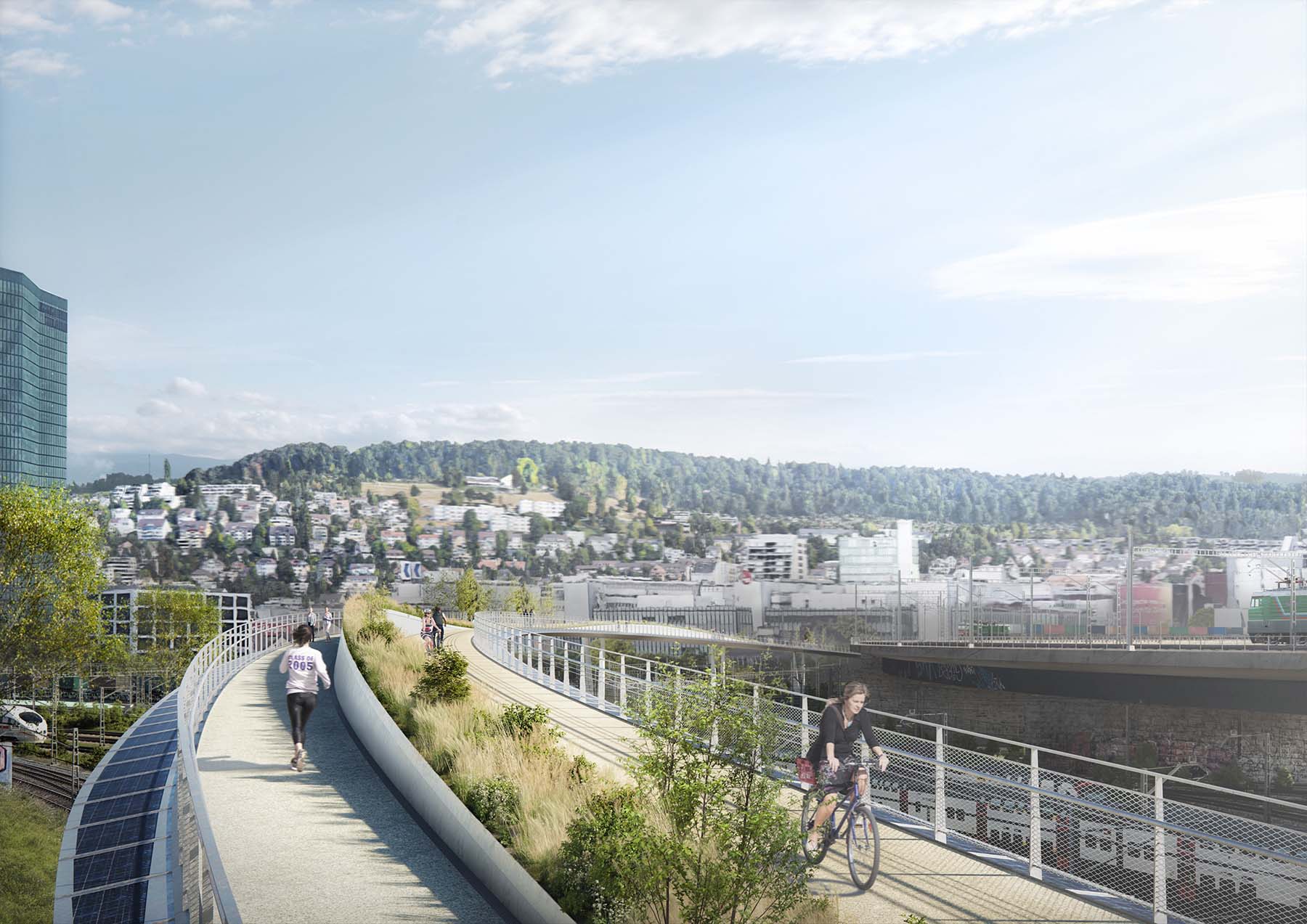 Zwischen den Zürcher Kreisen 4 und 5 plant das Tiefbauamt eine Velobrücke über das trennende Gleisfeld. Die Konstruktion der «Landschafts-Brücke» soll optimal auf den Fuss- und Veloverkehr abgestimmt sein.
