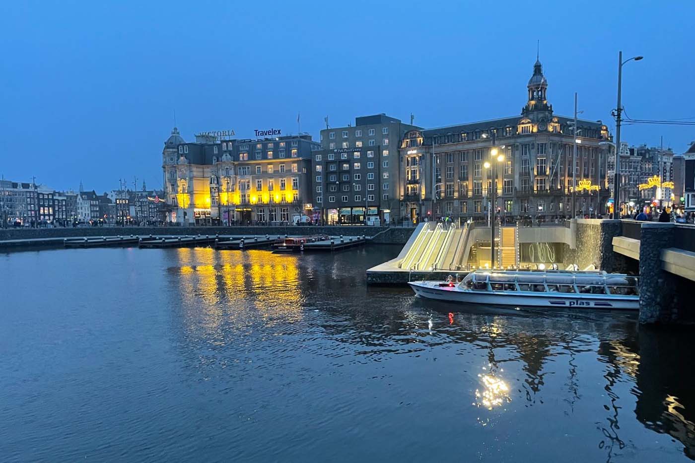 Die Veloabstellanlage am Stationsplein vor dem Amsterdamer Hauptbahnhof liegt vollständig unter der Wasseroberfläche. Rolltreppen führen hinunter in die Station.