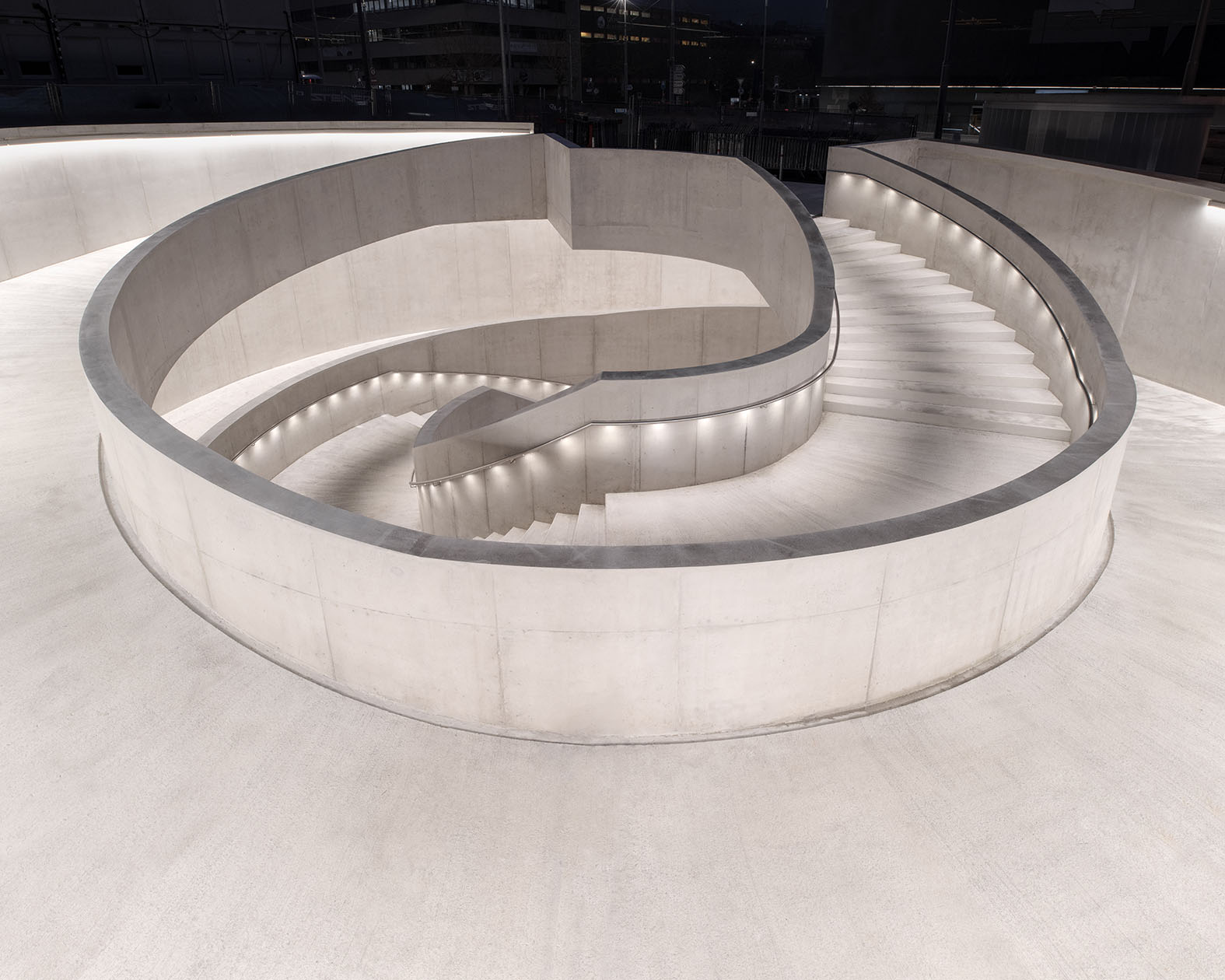 Das aus einer Doppelhelix-Form bestehende Bauwerk mit nur 10 Metern Radius beherbergt eine 3 Meter breite Wendeltreppe für die Fussgänger, welche von einer ebenso breiten entgegenlaufenden Velorampe umrahmt wird. Auch in der anschliessenden Unterführung mit Zugang zum Bahnhof werden die beiden Verkehrsströme weiterhin getrennt geführt, sodass Velofahrende und Zufussgehende problemlos aneinander vorbei kommen.