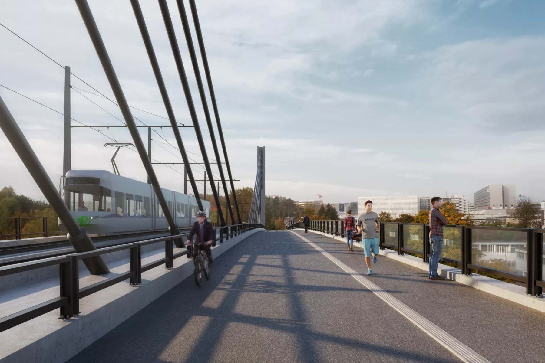 Die Pläne zur Verlängerung der Glattalbahn beinhalten auch eine Velo- und Fussgängerbrücke. (Visualisierung: Architron GmbH)