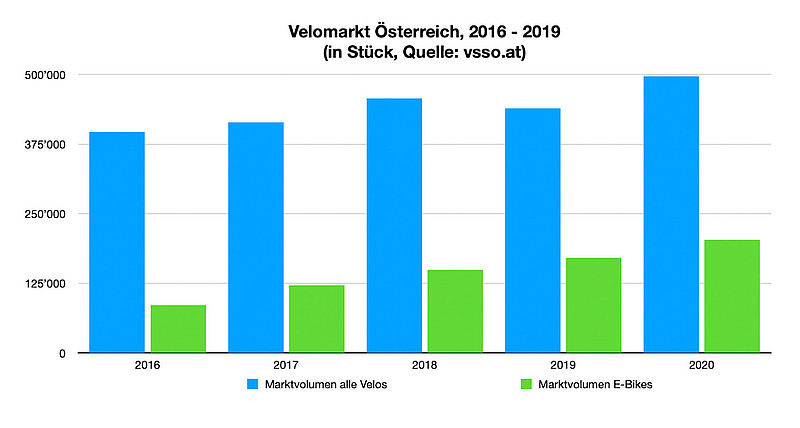 In Österreich werden die Veloverkaufszahlen regelmässig durch den Verband der Sportartikelerzeuger und Sportausrüster Österreichs (VSSÖ) erhoben und veröffentlicht. Die jüngste Erhebung zeigt, dass der Fahrradmarkt im Jahr 2020 von einer hohen Nachfrage und deutlichem Wachstum geprägt war.