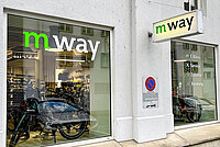 Neben der laut SEMG grössten E-Bike-Auswahl in Bern mit über 100 Modellen direkt an Lager und einer hellen, grossräumigen Ladenfläche gehören moderne, einladende Beratungs-Cubes mit Bildschirmen und Sitznischen, ein pflanzenbedachter Indoor-Trail für Testfahrten und eine offene Werkstatt zum Konzept. «Ein zentrales Element des Shops ist der hybride Verkauf», erklärt Reto Waeffler, CEO der Swiss E-Mobility Group (SEMG), zu der M-Way gehört. «Beratungen und Testfahrten vor Ort sind ebenso möglich wie digital unterstützte Kundengespräche und Online-Bestellungen.» Zudem entstehen mit der M-Way-Werkstatt grosse, neue Service-Kapazitäten, von denen E-Bike-Fahrerinnen und -Fahrer im Raum Bern künftig profitieren können.