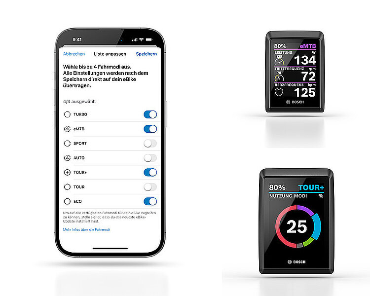 Zudem gewährt Bosch E-Bike Systems Elektrovelo-Fahrerinnen und -Fahrern mehr Einfluss bei der Frage, welche Fahrmodi zur Verfügung stehen: Statt auf die Konfiguration durch den Hersteller zu vertrauen, lassen sich nach dem App-Update bis zu vier Favoriten aus den für jeweilige Antriebseinheit zur Verfügung stehenden Fahrmodi auswählen und konfigurieren.