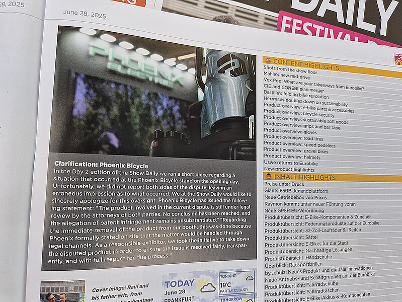 Am dritten Messetag drohte Shanghai Phoenix dem Messemagazin Eurobike Show Daily mit einer Verleumdungsklage und verlangte die Veröffentlichung einer Gegendarstellung. Shanghai Phoenix bestreitet den Vorwurf der Patentverletzung und verweist darauf, dass das entsprechende Verfahren noch nicht abgeschlossen sei.