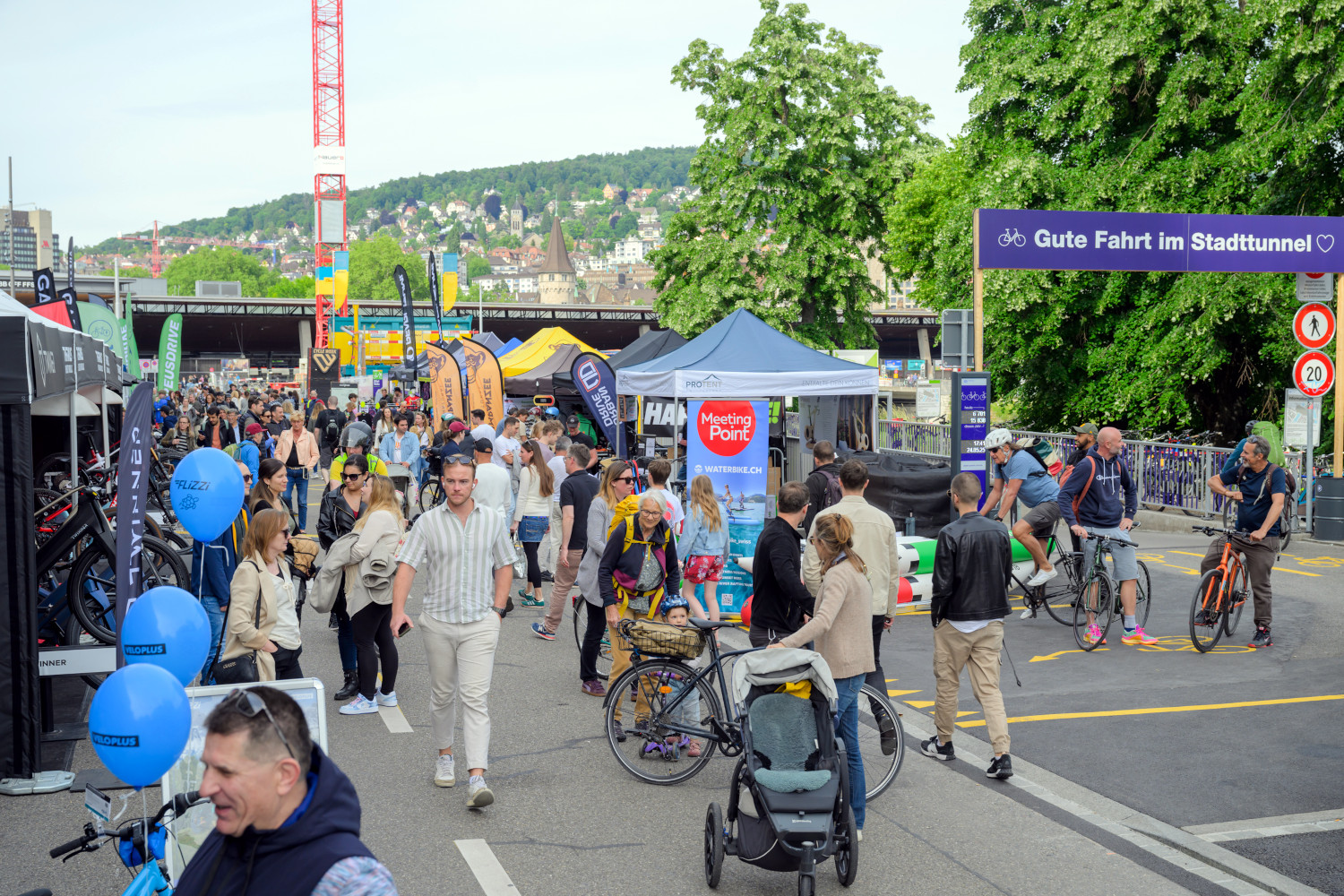 Cycle Week 2024. Viele Menschen laufen durch eine Strasse mit Verkaufsständen.