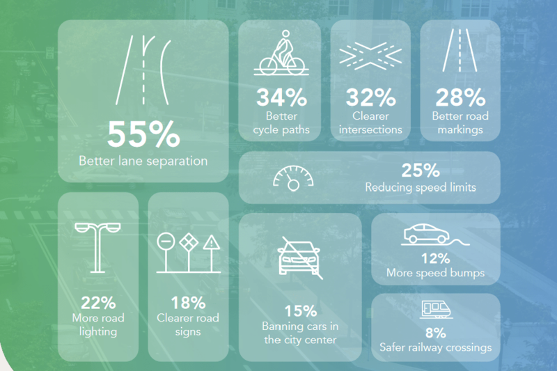 Rund ein Drittel der Umfrageteilnehmer wünscht sich zudem bessere Velowege, klarere Kreuzungen und bessere Strassenmarkierungen.