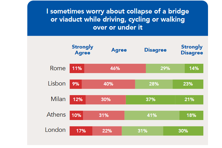 Gerade mal 28 %, respektive 43 % der Befragten begnügen sich mit den Bestrebungen der Regierung. So erstaunt es auch nicht, dass sich gerade in diesen Städten auffällig viele Verkehrsteilnehmer Sorgen um kollabierende Infrastruktur machen. In Milano beispielsweise fürchtet sich ein Drittel der Befragten davor, dass eine Brücke oder ein Viadukt zusammenbricht, währenddem sie dort velofahren.