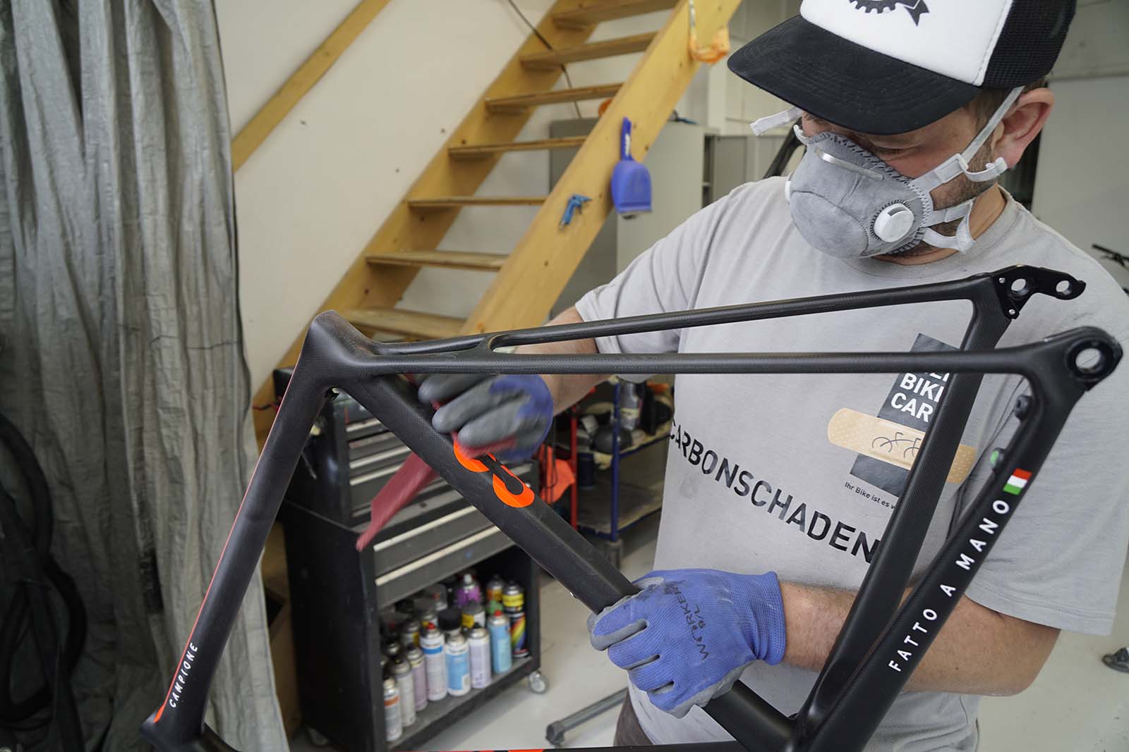 In den Räumlichkeiten einer ehemaligen Autowerkstatt in Steffisburg repariert er Schäden an Velorahmen aus Carbon und Alu und lackiert Fahrräder auf individuellen Wunsch. Zu seinen Kunden gehören Importeure, Fach- und Grosshändler, Profiathleten, Privatpersonen und Schweizer Velohersteller.