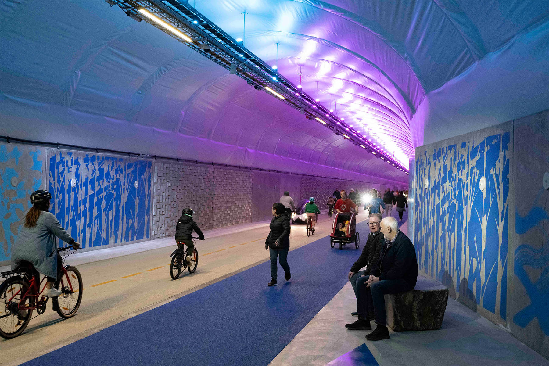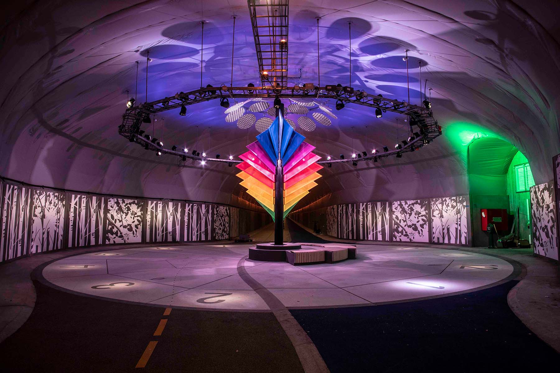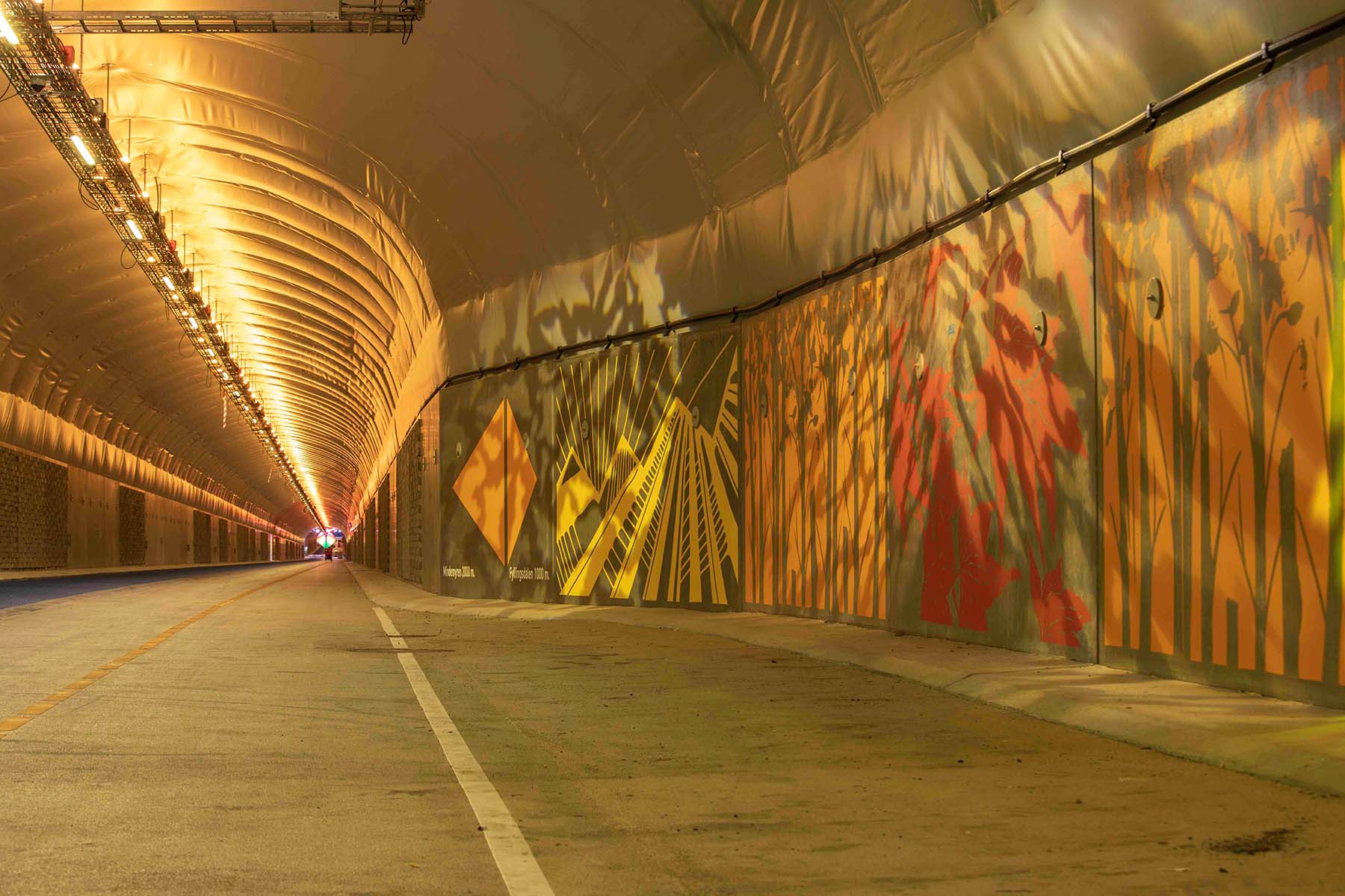 Damit während der Fahrt durch den schnurgeraden Tunnel keine Tristesse aufkommt und die Velofahrenden einschätzen können, wo sie sich befinden, wurden die Wände mit bunten Kunstwerken und Installationen gesäumt. In der Mitte des Velotunnels steht eine grosse künstliche «Sonnenuhr», die auch für zeitliche Orientierung sorgt.
