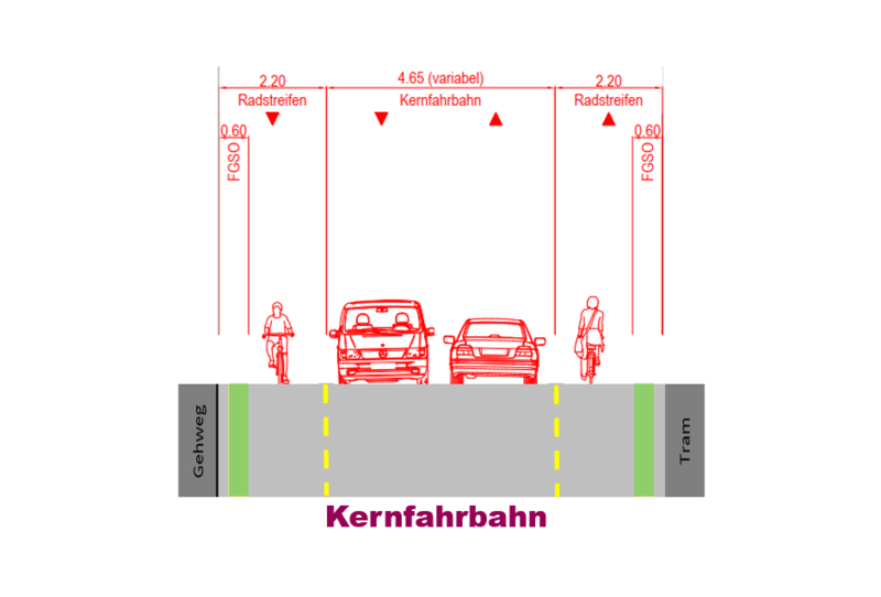 Die BfU empfiehlt bei Kernfahrbahnen eine Radstreifenbreite von mindestens 1.5 Metern und eine Kernbreite von mindestens 4.5 Metern. Ohne die bremsenden Bankette könnten die Autos problemlos kreuzen. (Bild: Stadt Zürich)