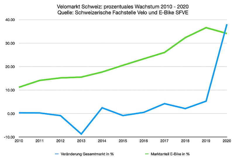 Die hohe Nachfrage nach günstigen Einsteigermodellen liess 2020 den Marktanteil von E-Bikes erstmals leicht schrumpfen. Damit ist im laufenden Jahr schon wieder Schluss. (Grafik: ZVG)