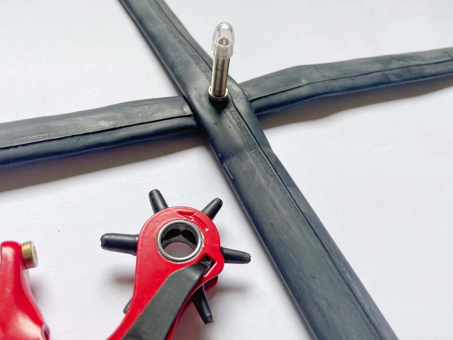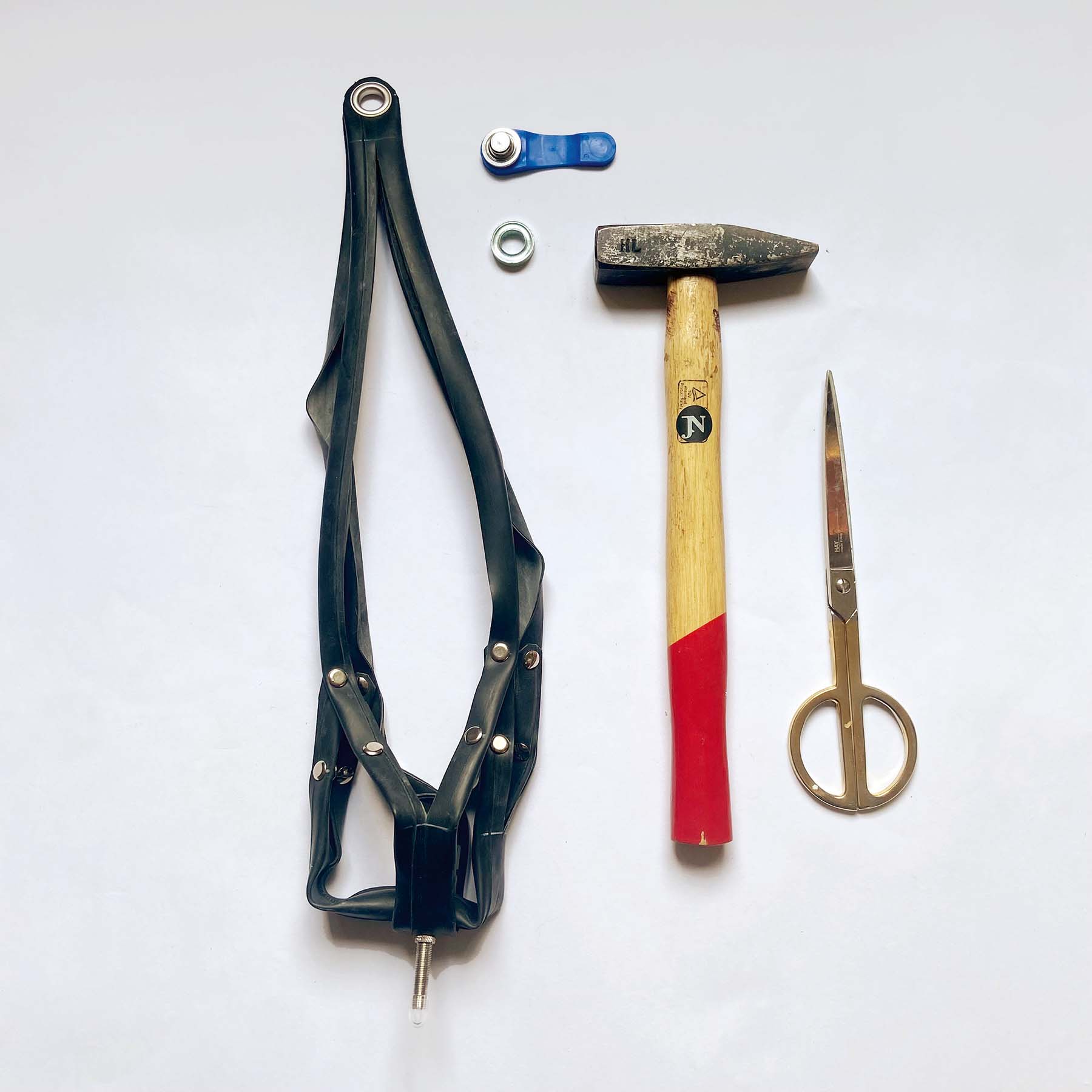 Schritt 5: Gegenüberliegende Schlauchenden zusammenfassen und präzise aufeinanderlegen. Mittig lochen, Öse platzieren und einschlagen. Rundung schneiden. Andere zwei Enden knapp hinter oberen Nieten zurückschneiden.