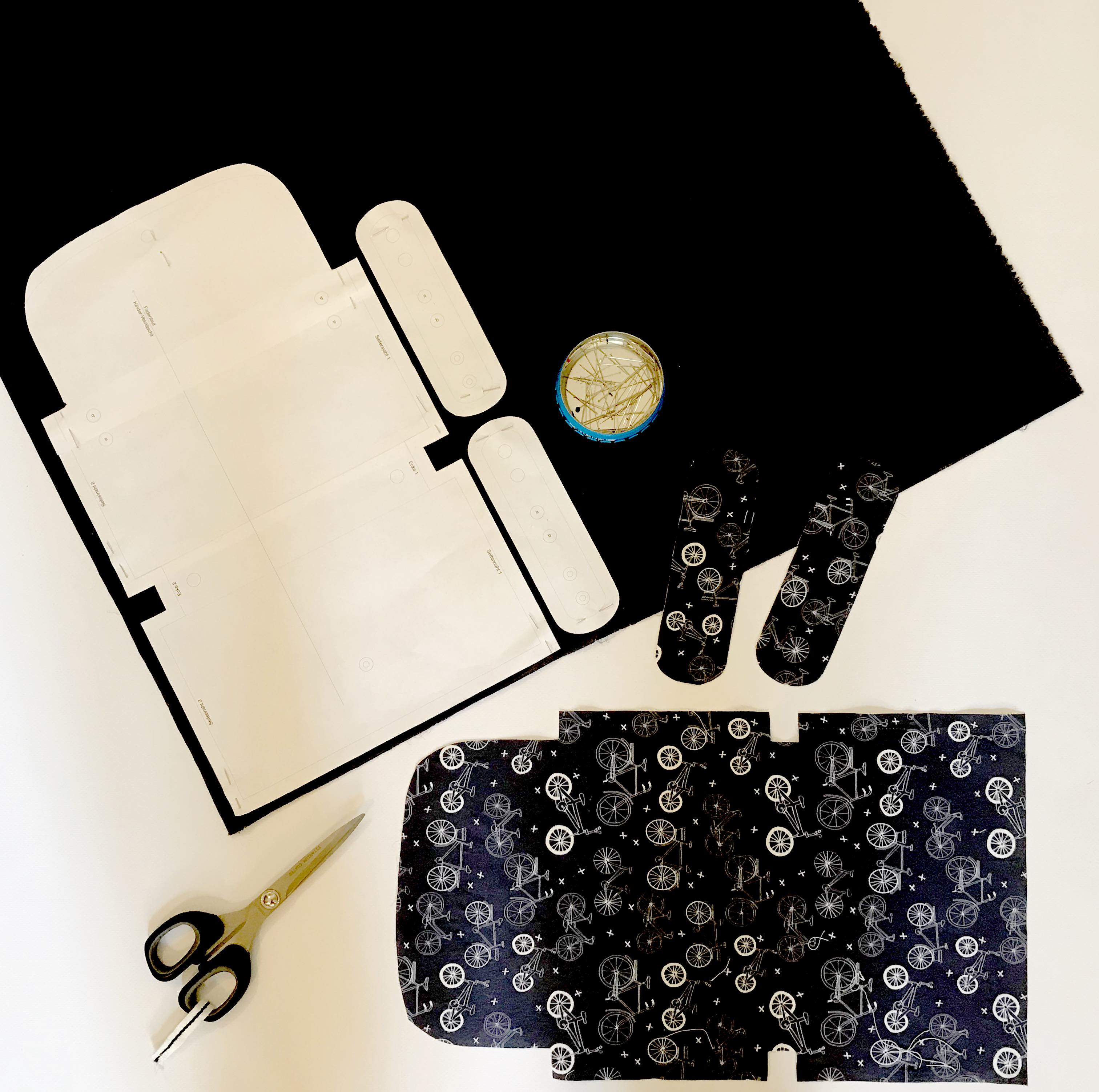 Papier, Klebstreifen, Faden, fester Stoff (z.B. Jeans oder Gabardine, Futterstoff, Color Snaps), Schnittmuster als PDF