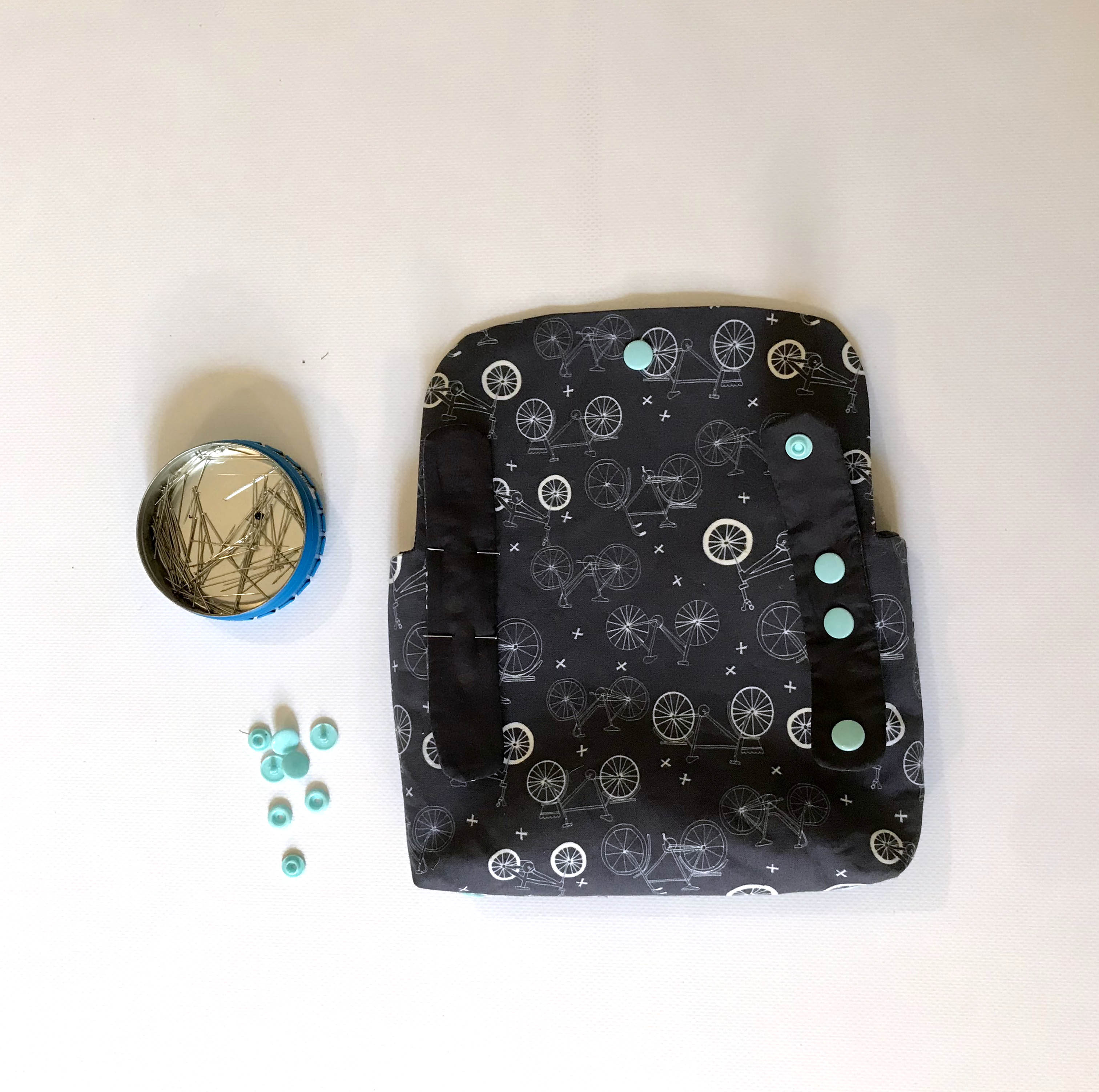 Color Snaps wie auf dem Schnittmuster eingezeichnet platzieren. Die Riemen werden mit je zwei einzelnen Snaps am Täschli befestigt. Am Täschliboden ebenfalls zwei einzelne Snaps durch den Oberstoff und das Futter stechen, damit das Futter nicht rausrutschen kann. Snaps an Täschli und Riemen mittig platzieren.