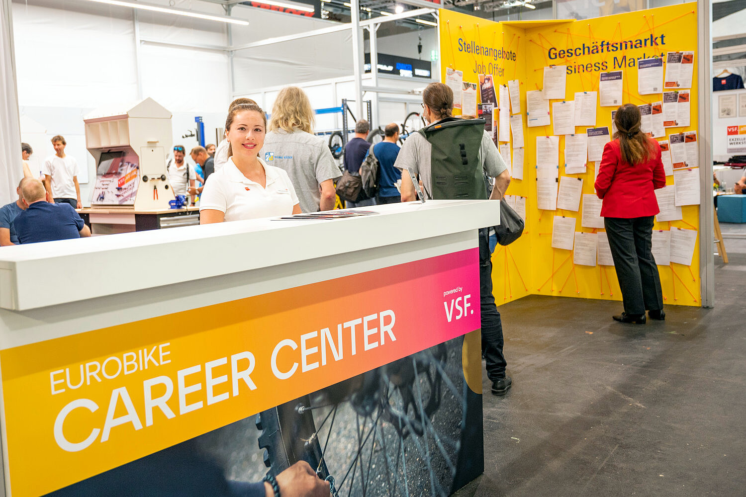 Egal ob in der Werkstatt, im Verkauf, bei Vertriebsspezialisten oder Herstellern: Die Velobranche tut sich schwer, qualifizierte Arbeitskräfte anzuziehen. Daran wollen die Eurobike und der Verbund Service Fahrrad (VSF) etwas ändern, weshalb bei der Premiere der Messe in Frankfurt das «Career Center» lanciert wurde. Der gemeinsame Schwerpunkt liegt dabei auf der gezielten Ansprache von potenziellen Quereinsteigern in die Branche. Diese sollen über fachspezifische Ausbildungen, Studiengänge, Weiterbildungen und Praktika rund ums Fahrrad informiert werden.