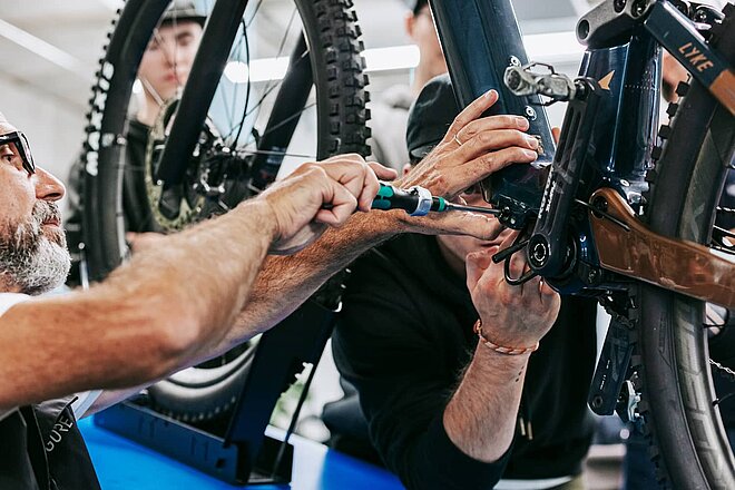 Informative Theorieeinheiten wechseln sich mit spannenden Praxisschulungen ab. Die Teilnehmer erhalten detaillierte Insights zum Fazua Ride 60 Antriebssystem und der dazugehörigen Diagnosesoftware.