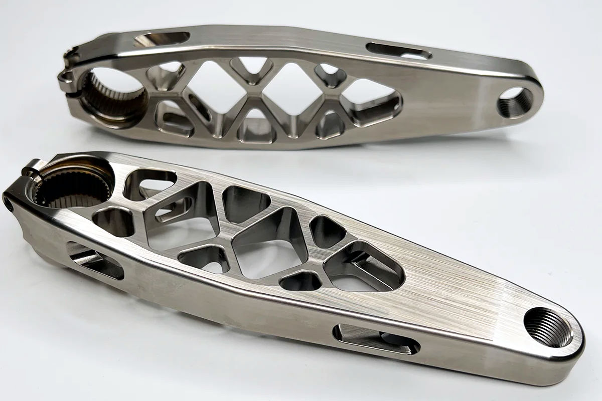Als Tochterunternehmen eines führenden, kalifornischen Anbieters komplexer Komponenten für die Raumfahrt- und Medizinalindustrie scheut der CNC-Spezialist 5DEV bei der Konstruktion und Produktion von Teilen für den Einsatz an Mountain und Enduro Bikes keinen Aufwand. Das Sortiment des Unternehmens aus San Diego umfasst ausser Kurbeln auch verschiedene Kettenblätter, Plattformpedale und Vorbauten - wahlweise aus Titan oder aus Aluminium. Nach einer exakten Berechnung der im Fahrbetrieb zu erwartenden Belastungen und Kräfte werden die Fräsen angeworfen, um Anbauteile mit einem optimalen Verhältnis von Gewicht zu Belastbarkeit zu fertigen.