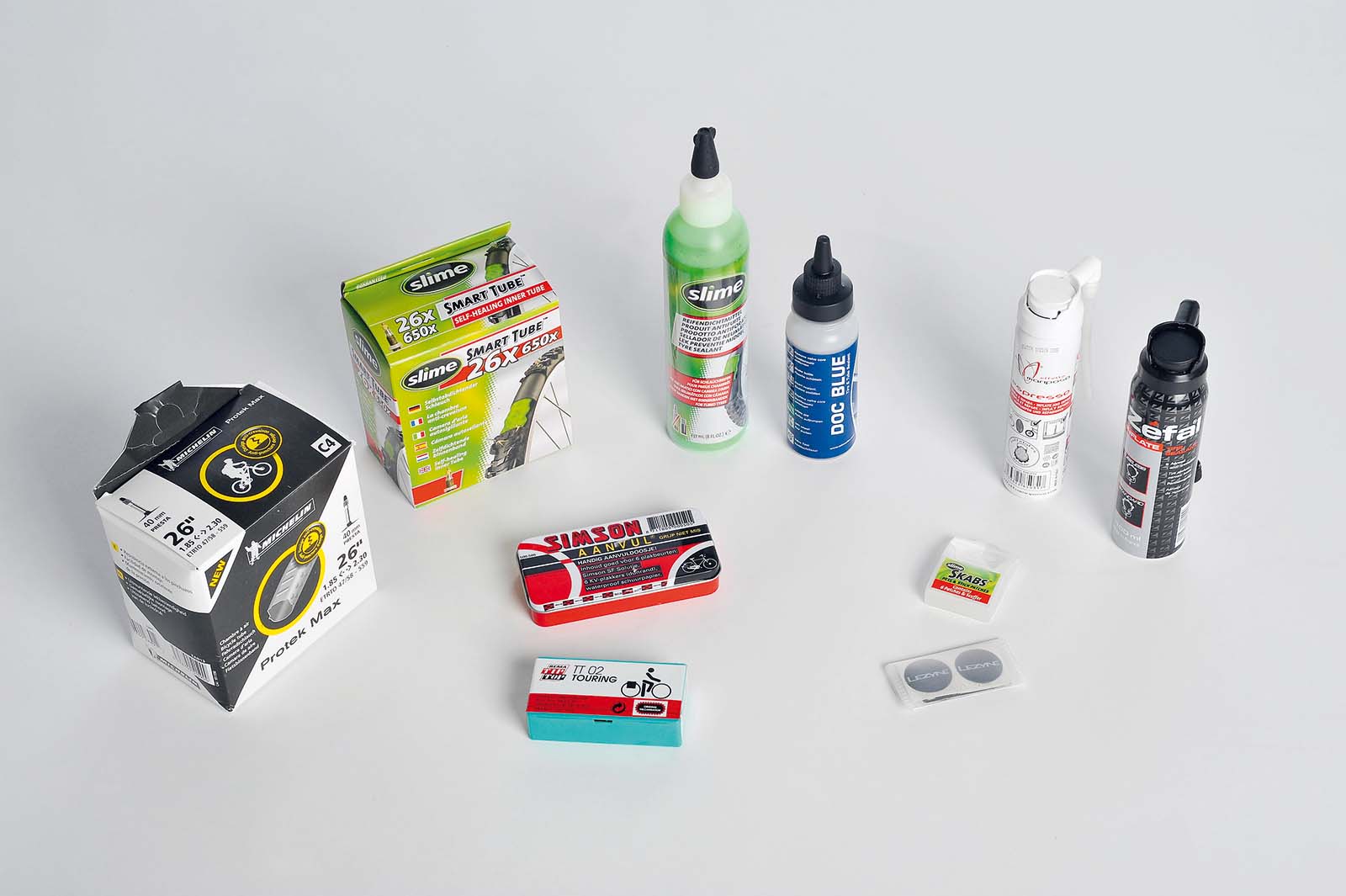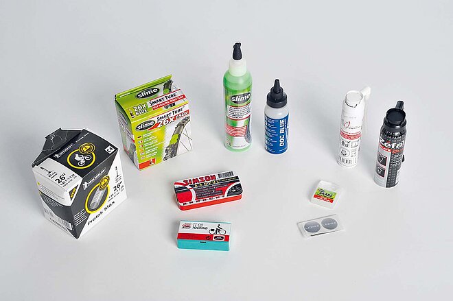 Für die Reifenreparatur benötigt man Flickzeug (Flicken, Gummilösung, Schleifpapier), Pneuhebel (am besten solche aus Kunststoff) und eine Pumpe.