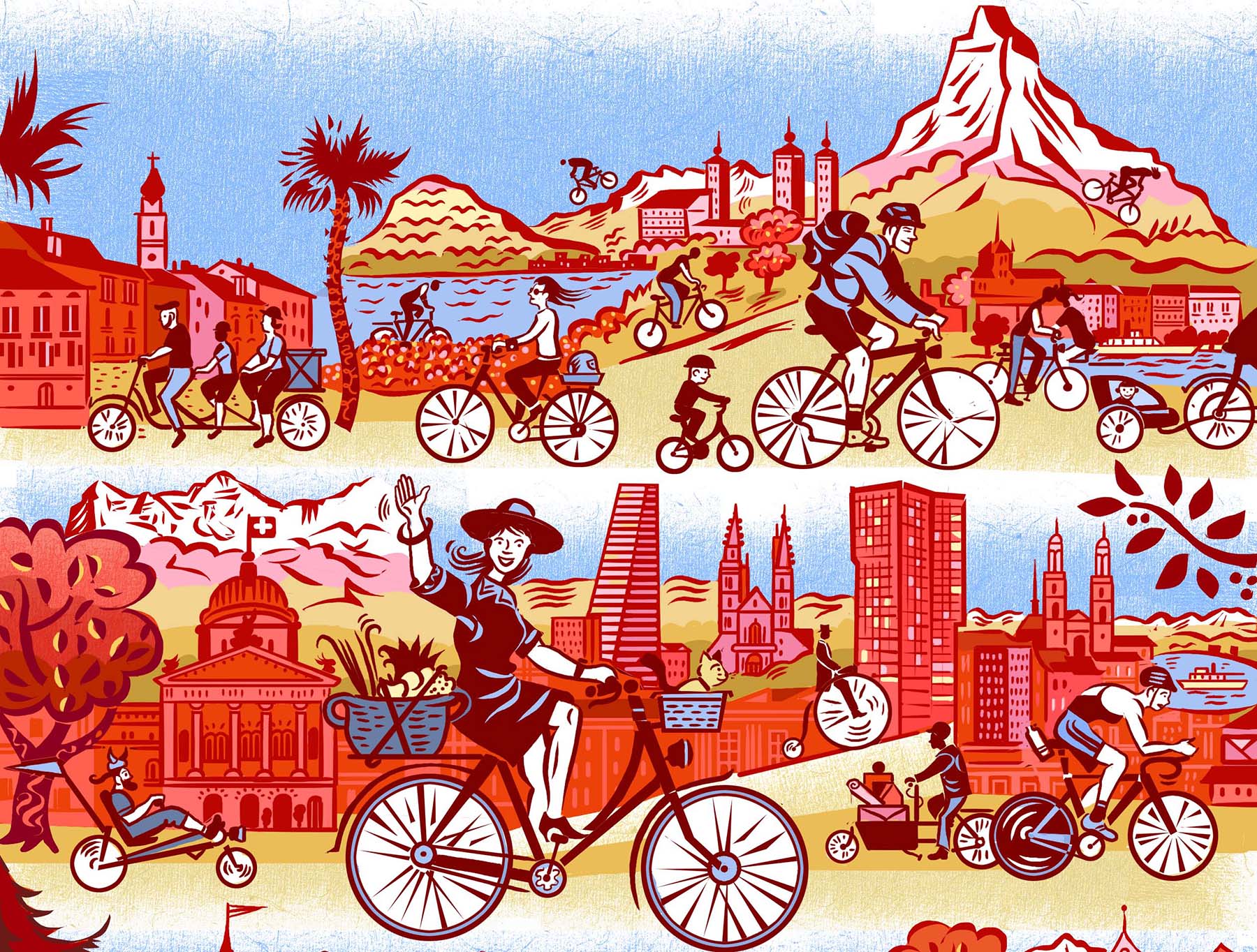 Der bekannte Illustrator Andrea Caprez hat für Velojournal ein exklusives Titelbild gestaltet. Als Weihnachtsgeschenk an unsere Leserinnen und Leser bieten wir die bunte Rundfahrt durch das Veloland Schweiz als Poster an. Das Poster kann kostenlos als PDF zum Ausdrucken heruntergeladen werden.