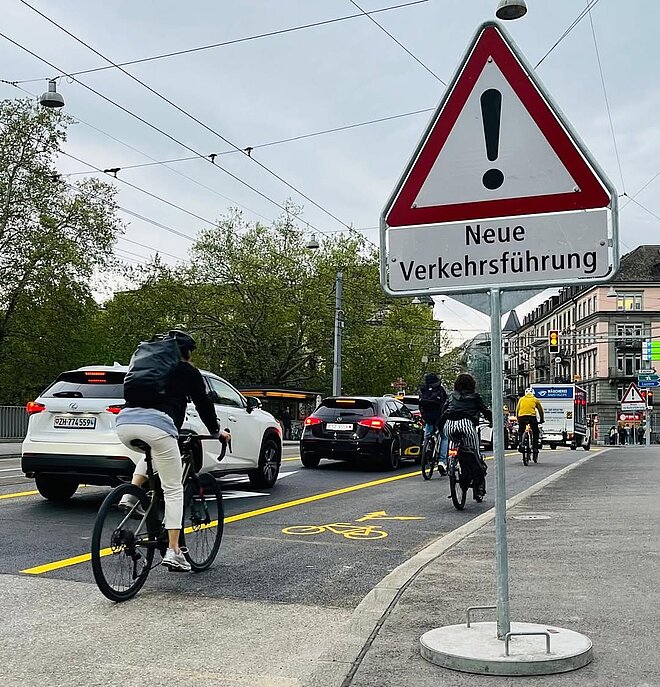Die Stadt Zürich hat im April die Verkehrsführung auf der Gessnerbrücke angepasst. Die bisher getrennte Fahrspur in Richtung Löwenplatz und die Abbiegespur in die Gessnerallee wurden zusammengelegt. Dadurch entstand ein durchgehender 2,5 Meter breiter Velostreifen, der Velofahrenden deutlich mehr Sicherheit bietet. Bislang mussten sie sich stadteinwärts entweder die Fahrbahn mit Autos oder das Trottoir mit Zu-Fuss-Gehenden teilen.