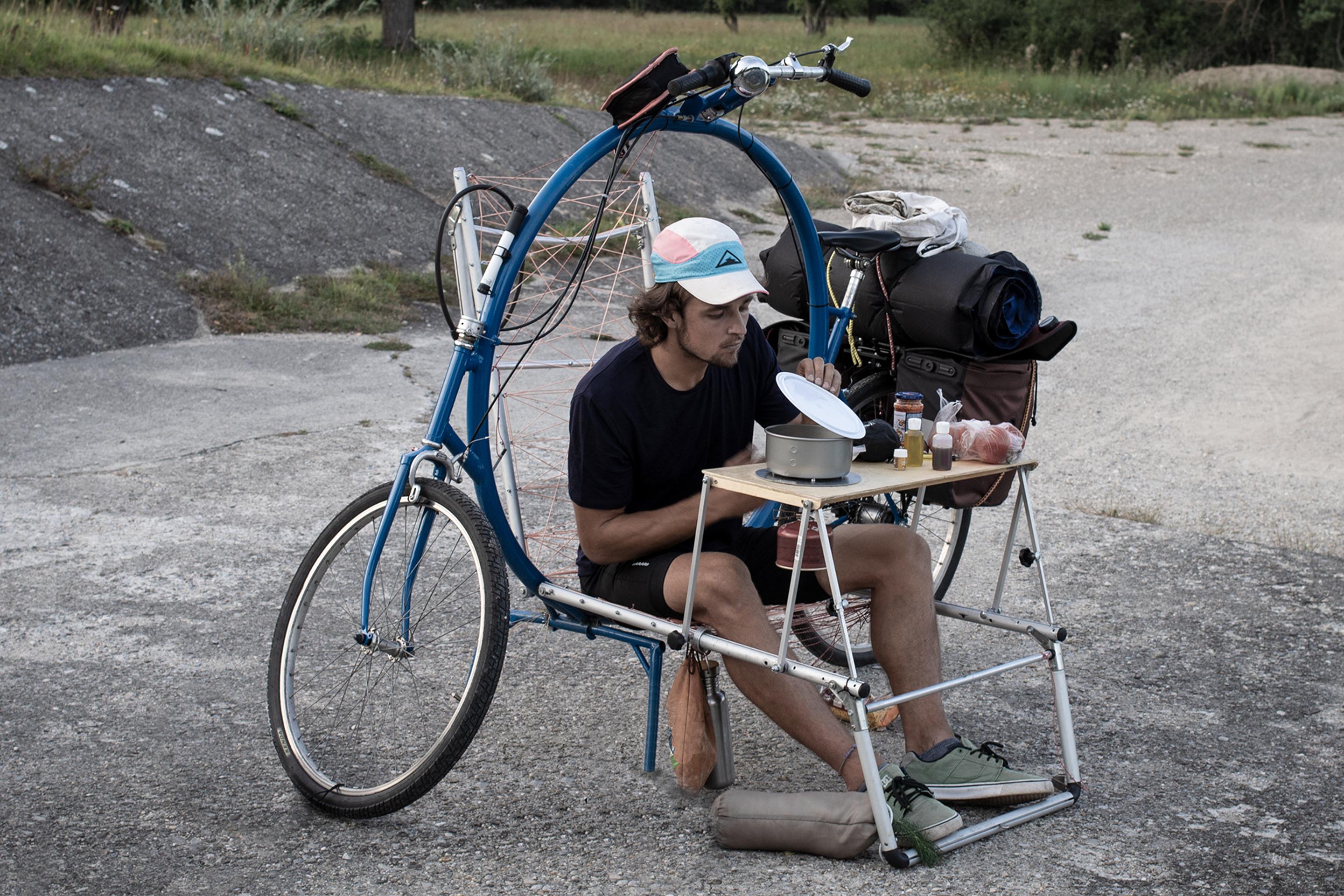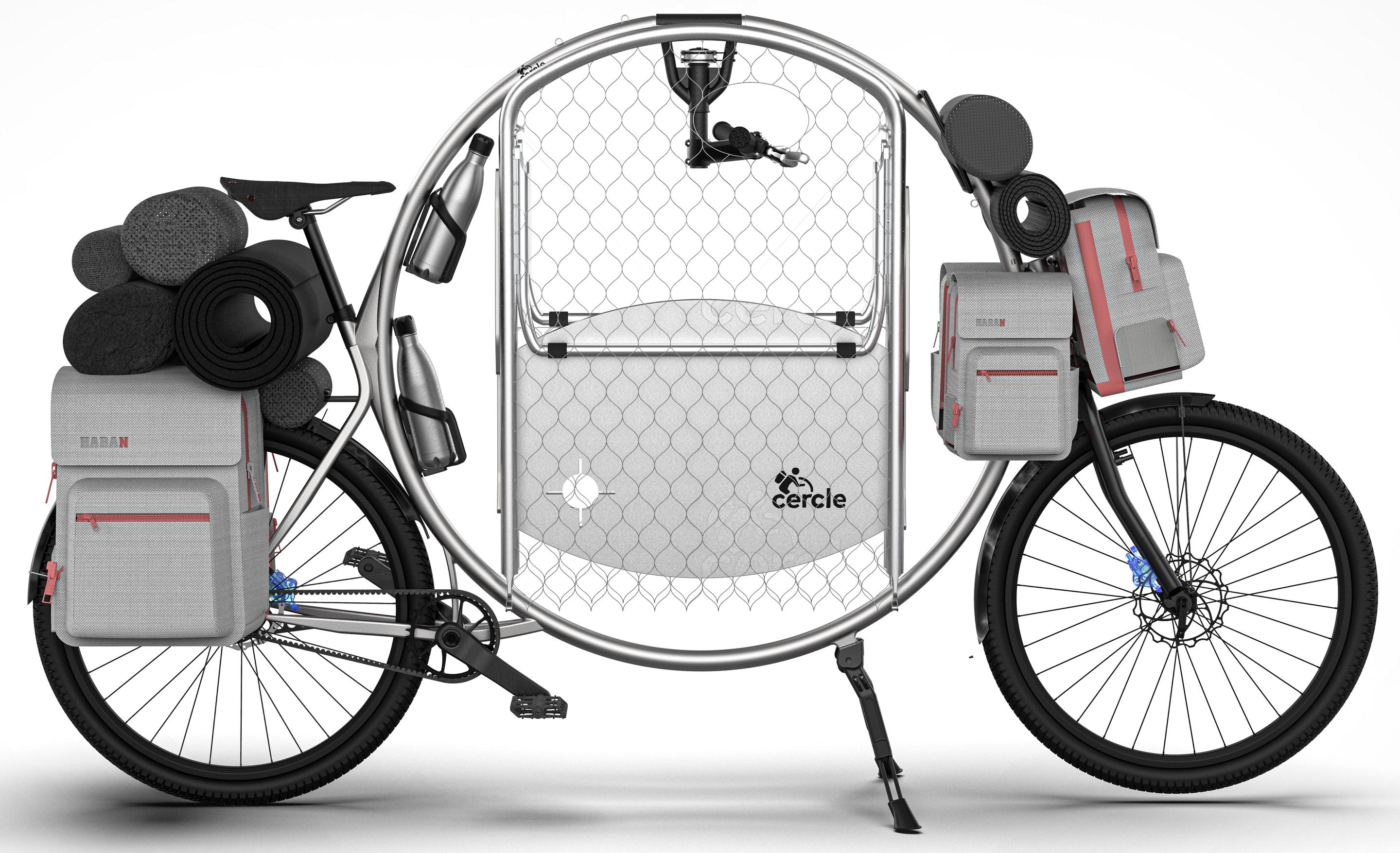 Das Cercle Bike ist nicht nur ein Velo, sondern verbirgt in seinem kreisförmigen Rahmen auch Tisch und Stuhl und kann sogar zum Bett oder Zelt umgebaut werden. So ist bei Veloreisen direkt alles dabei.