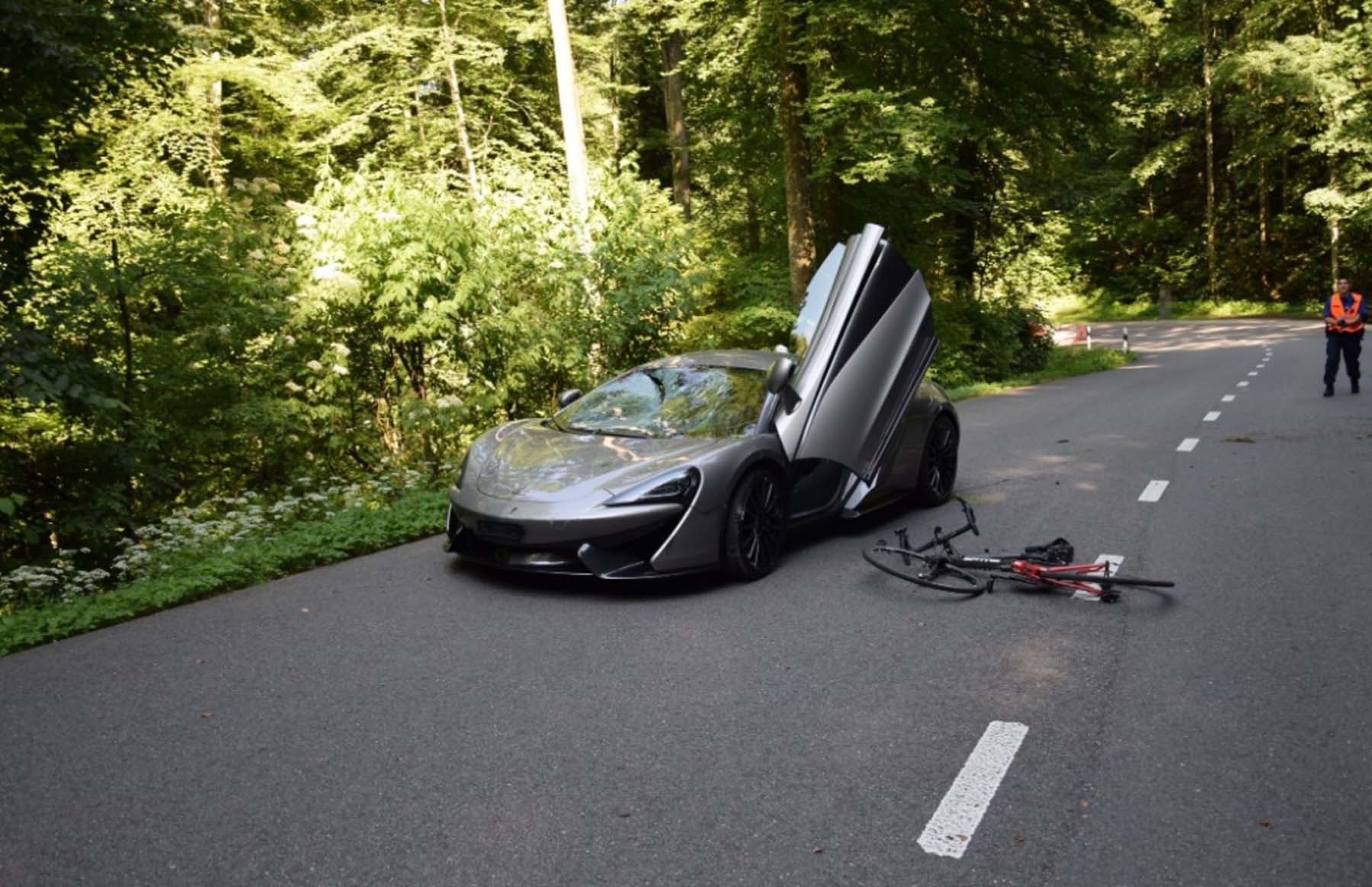 Hinter dem Steuer des 570 PS starken McLaren «570 S Spider» sitzt ein 23-jähriger Mann aus dem Kanton Jura. Mit seinem Boliden erfasst er den Velofahrer frontal. Dieser prallt mit voller Wucht gegen die Windschutzscheibe und wird anschliessend über das Auto geschleudert.