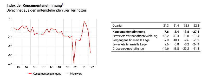 Diese Befürchtung wird von den neusten Zahlen des Staatssekretariats für Wirtschaft (SECO) unterstrichen. Denn im April 2022 sackte die vier mal pro Jahr erhobene Konsumentenstimmung in der Schweiz so stark ab wie zuletzt im Frühjahr 2020, als die Schliessung der Ladenlokale und Gastronomie für viel Verunsicherung sorgte.