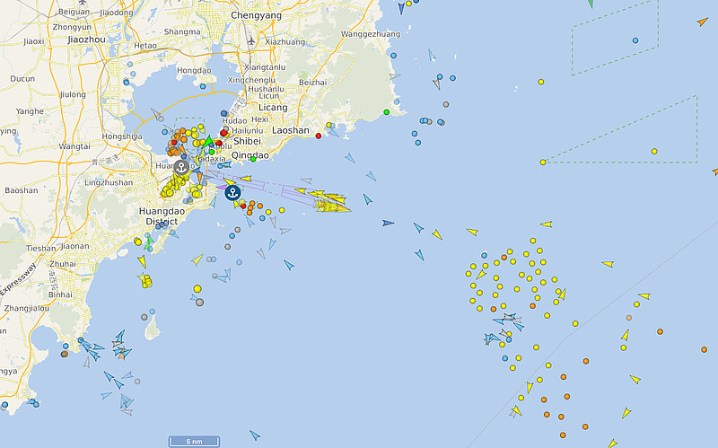 Vor dem Hafen von Qingdao, auf halbem Weg zwischen Shanghai und Peking, stauen sich aktuell bereits doppelt so viele Frachtschiffe wie üblich. (Bild: vesselfinder.com)