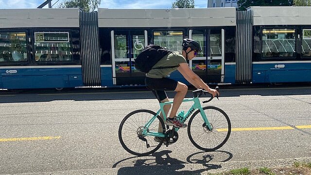 Tramschienen sind für Velofahrende in der Stadt eine häufige Unfallursache. Zur Sicherheit sollten Schienen immer mindestens in einem 45°-Winkel gequert werden. Auch sonst ist beim Tram besondere Vorsicht geboten. Ein Tram hat bei gleichem Tempo einen deutlich längeren Bremsweg als ein Auto. Deshalb hat das Tram immer Vortritt.