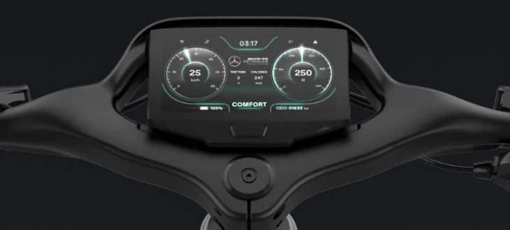 Das Mercedes-Elektrovelo verfügt über einen nicht näher spezifizierten Heckmotor mit 250 W Leistung, der eine Tretunterstützung bis 25 km/h bietet. Der Elektromotor wird von einem 360-Wh-Akku mit Strom versorgt. Optional ist ein 180-Wh-Zusatzakku erhältlich.
