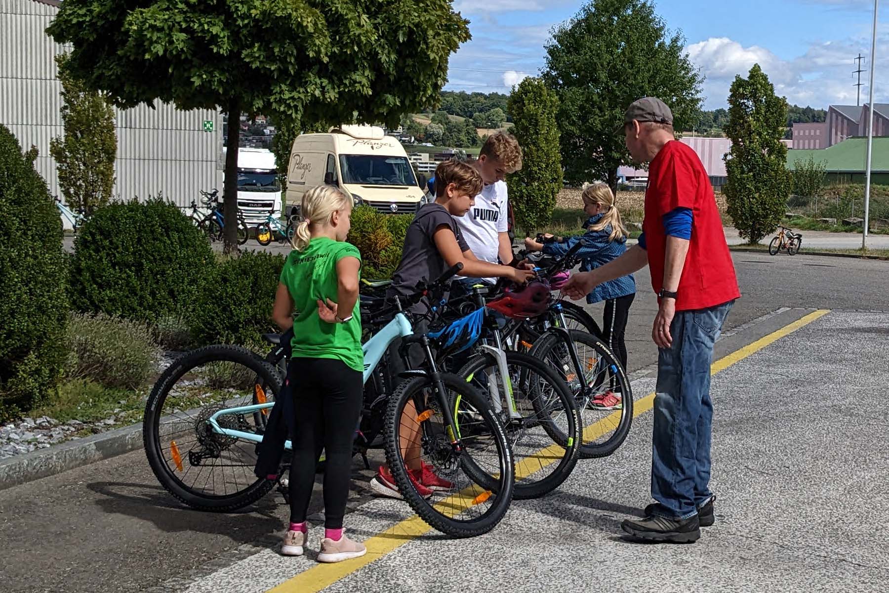 Auf die jungen Teilnehmerinnen und Teilnehmer warten vier Posten: stehender LKW, fahrender LKW, Velo-Parcours, Helm- und Velo-Check. Beim Besuch von Velojournal stand eine bunte Kinderschar bereit. Eingefunden haben sich alle auf dem Areal eines grossen Camionneurs in Villmergen. Das Speditionsunternehmen stellt für den Kurs auch den stehenden Lastwagen zur Verfügung, an dem der Tote Winkel hautnah erlebt werden kann.