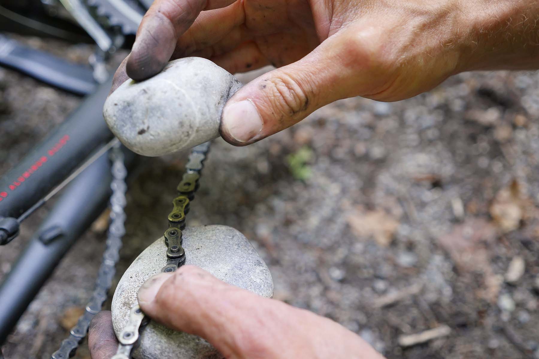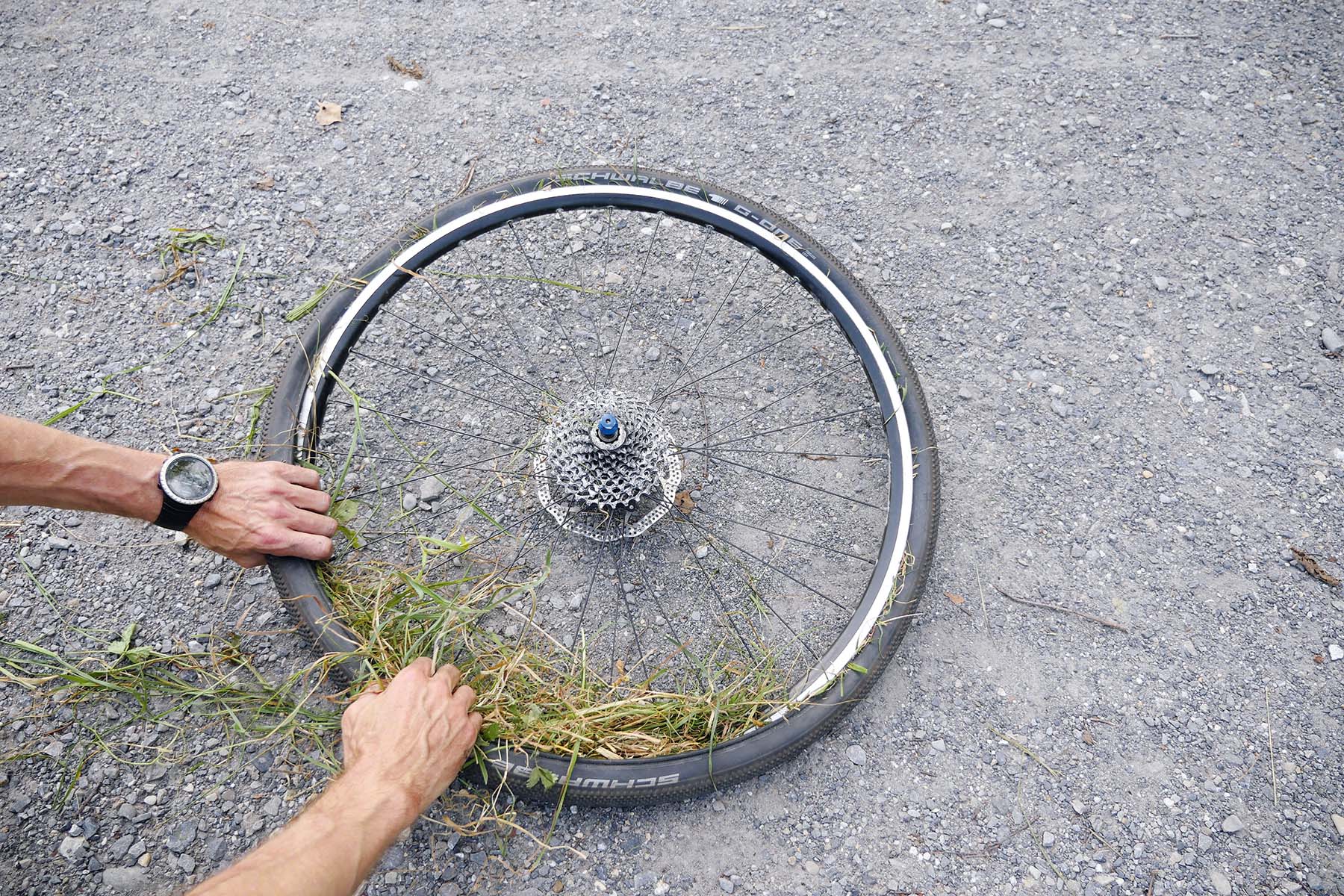 Reparaturen mit Stein und Gras: Eine Velopanne unterwegs und weder Ersatzschlauch noch Ersatzteile dabei? Mit diesen Tipps kommen Sie trotz Kettenriss oder platten Fahrradreifen ans Ziel.