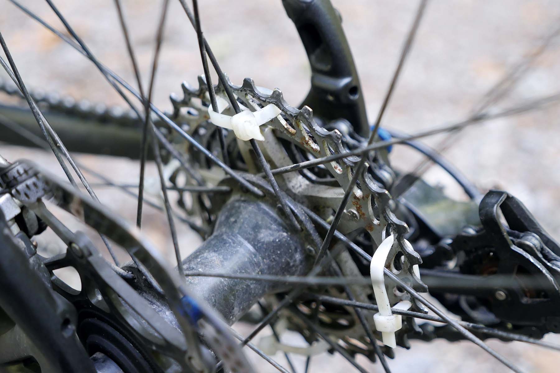 Lösung: Mit Kabelbindern wird die Zahnkranzkassette an den Speichen festgemacht.