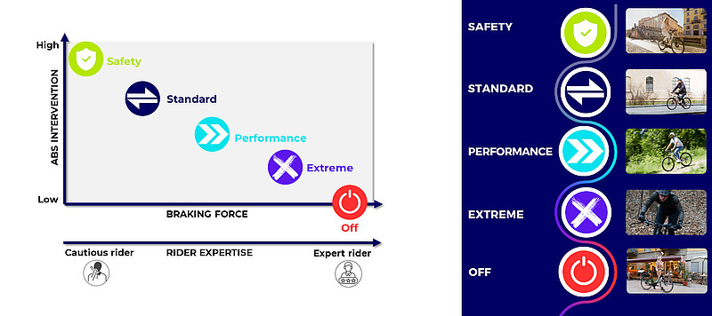Die «Standard»- und «Performance»-Einstellungen richten sich an erfahrenere Nutzerinnen und die «Extreme»-Einstellung ist für eine sportliche Gangart auf dem E-Mountainbike gedacht. Zudem lässt sich das ABS-System komplett deaktivieren.
