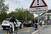 In Baden erhält der Veloverkehr am Schulhausplatz in Richtung Hochbrücke ein eigenes Lichtsignal. Velofahrende können künftig bei Grün losradeln – auch wenn der Autoverkehr wegen Rückstau Rot hat. Auch bei der Ausfahrt der Tunnelgarage in Richtung Bahnhof wurde nachgebessert: Eine zusätzliche Veloampel steht neu rund fünf Meter hinter der bestehenden Anlage. Die bisherige Signalisation war für Velofahrende schlecht einsehbar, insbesondere im Zusammenspiel mit ausfahrenden Bussen. Die neue Position schafft Klarheit und reduziert abrupte Bremsmanöver.