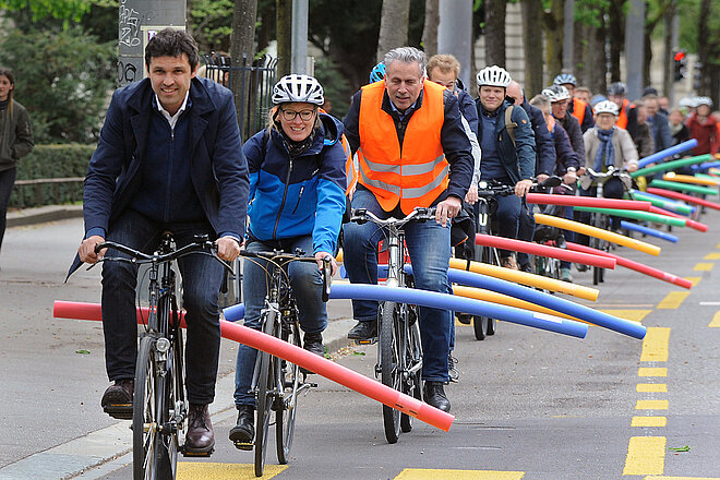Mit einer Badenudel-Aktion wurde am 27. April in Bern auf das Problem hingewiesen. Der Nationalrat und Pro-Velo-Präsident Matthias Aebischer radelte zusammen mit Delegierten des Verbands und Veloaktivistinnen durch die Hauptstadt zum Bundeshaus. Mit farbigen Badenudeln auf dem Gepäckträger zeigte der Konvoi, wie viel Mindestabstand aus Sicht der Radfahrenden wünschenswert ist. Die Petition kann online unterzeichnet werden: www.1m50.ch Fotos: Franziska Scheidegger Der Konvoi der Badenudel-Aktion zieht durch Bern.