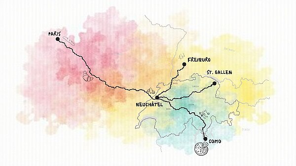 Nicht nur während des Festivals, sondern bereits auf dem Weg dorthin soll pedaliert werden. Die Organisatorinnen schlagen vier Routen für die Anfahrt nach Neuchâtel vor. Einerseits westlich von Paris über den Französischen und Schweizer Jura oder von Osten ab St. Gallen quer durch die Schweiz.