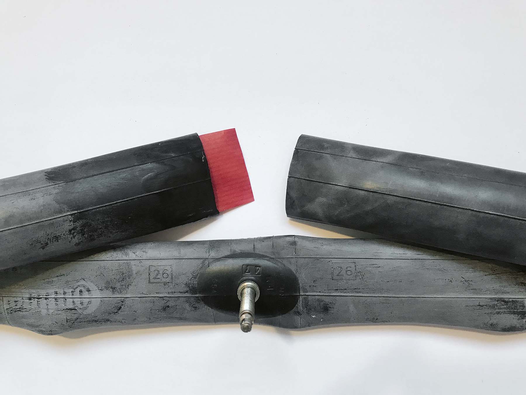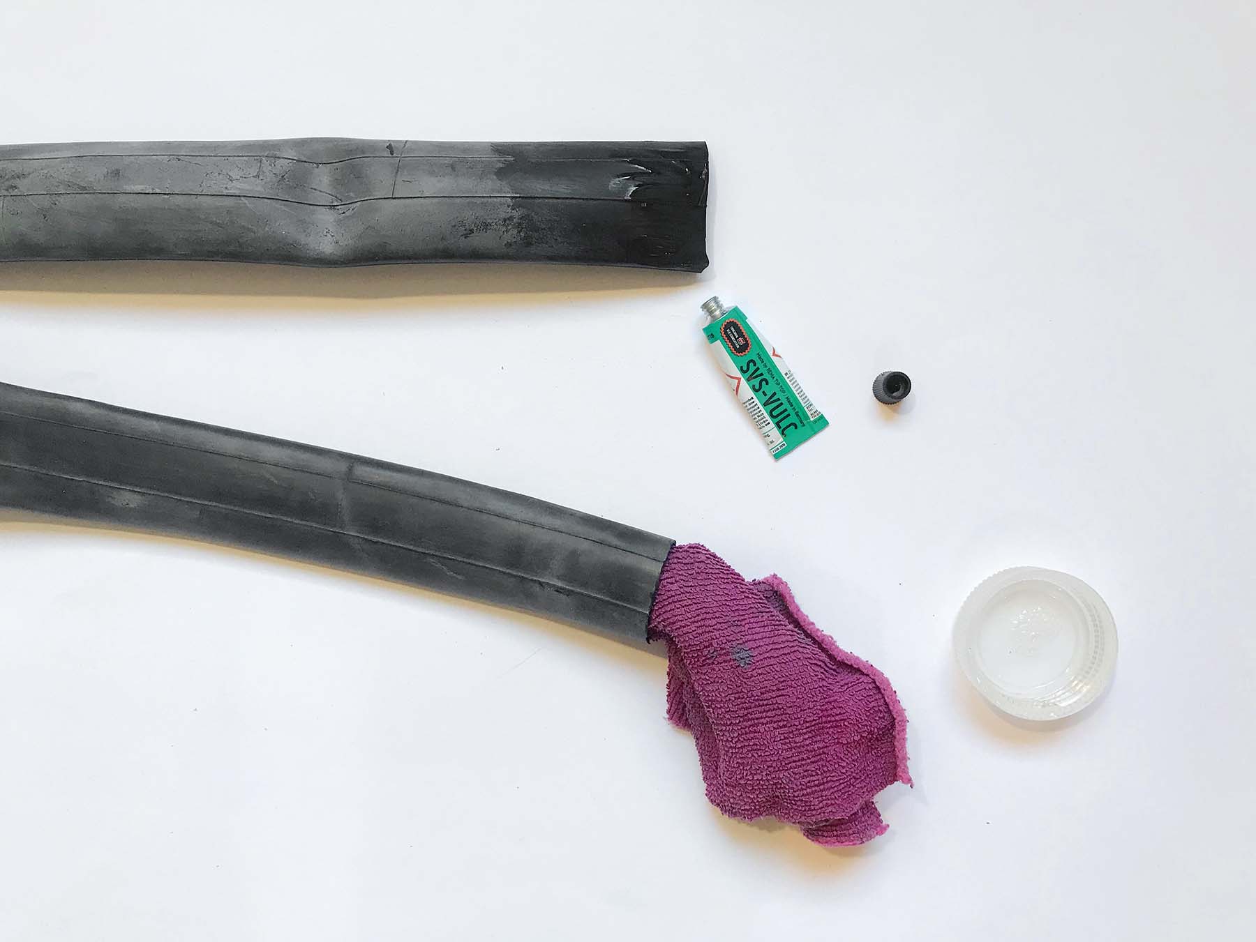 1–2 Veloschläuche, Vulkanisierflüssigkeit, Fettlöser*, Lappen, Gaffer-Tape, kleiner Papierstreifen, Bücher zum Beschweren