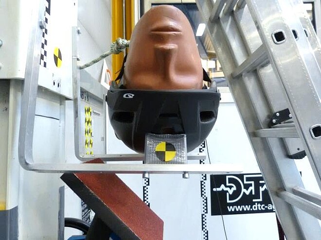 Laut den Unfallexperten haben noch weitere Faktoren Einfluss auf die Schutzwirkung eines Velohelms vor Rotationskräften. So sei es wichtig, dass der Helm auf der Aufprallfläche gut rutscht. Von Bedeutung sei auch, dass keine abstehenden Elemente – zum Beispiel eine Befestigung für Visiere, kleine Kunststoffohren oder Lüftungsschlitze – das Rutschen des Helms auf der Aufprallfläche hindern. Entsprechend seien eine runde Form und eine glatte Kunststoffschale optimal für einen bessern Schutz. Die Schutzwirkung eines Mips-Velohelms ist laut BfU besser als jene eines herkömmlichen Helms – sofern der Mips-Helm qualitativ gut ist. In der ersten Versuchsreihe wurde eine Fallvorrichtung, bestehend aus einer vertikalen Führung und darauf fahrendem Schlitten, verwendet. Die Helme wurden auf einer definierten Höhe positioniert und auf eine um 45° geneigte Stahlplatte fallen gelassen. In der zweiten Versuchsreihe wurden die Helme auf einem kompletten Crashtest-Dummy, der seitwärts auf einen Schlitten gelegt wurde, getestet. Dieser Versuch entspricht einem Unfall, bei welchem die Person mit dem Gesicht zum Boden aufschlägt. Fotos: BfU