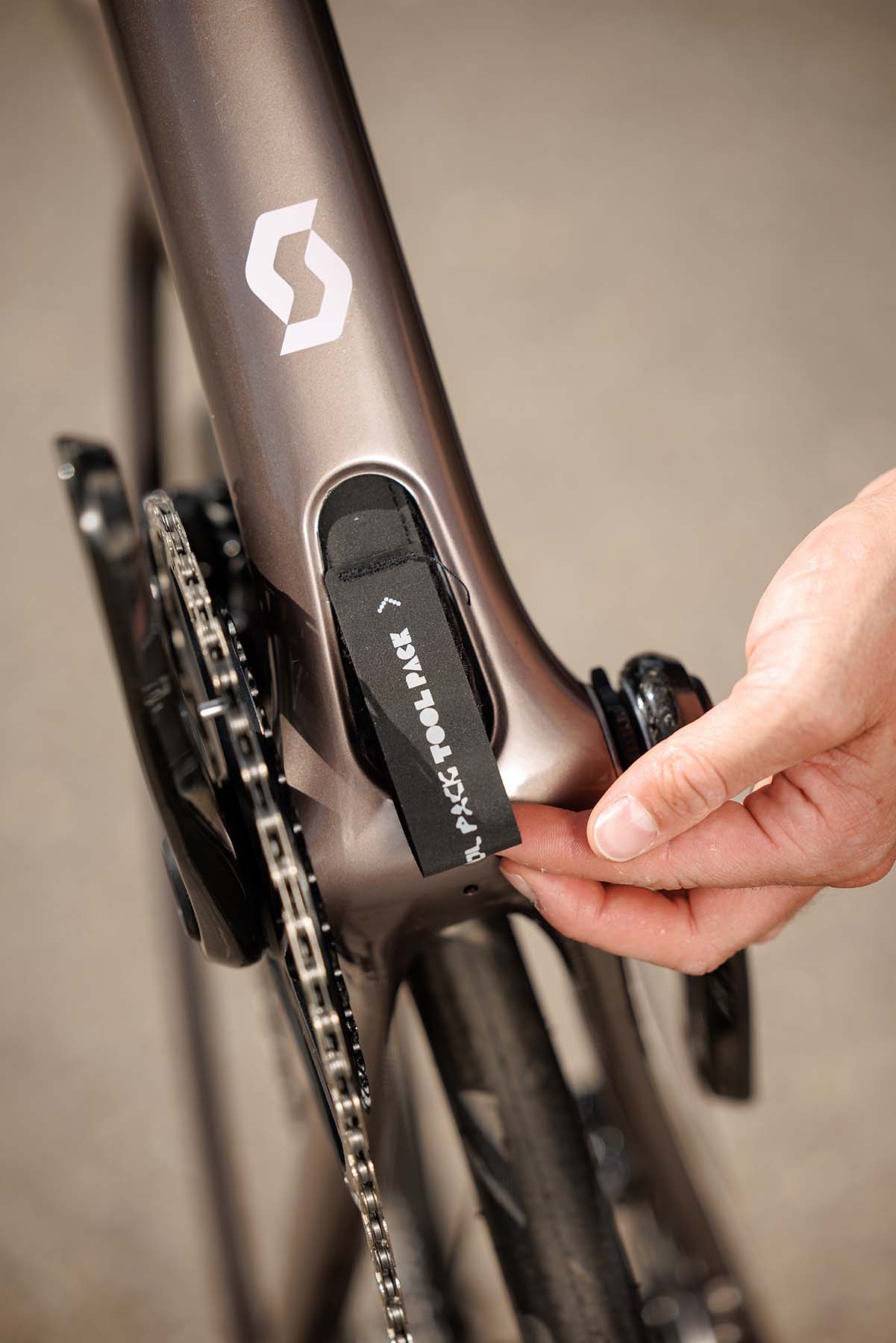 Für den täglichen Einsatz und lange Touren hat Scott den Rennvelos einige pfiffige Lösungen spendiert. Im Unterrohr ist ein «Save-the-Day»-Kit mit den wichtigsten Pannenhelfern unauffällig integriert. Zusätzlich kann eine passgenaue Rahmentasche im vorderen Rahmendreieck montiert werden, die Platz für eine Regenjacke, Verpflegung oder Werkzeug bietet. Abgerundet wird das Gesamtkonzept durch Syncros-Komponenten wie dem Cockpit, der Sattelstütze mit optionalem Rücklicht und der unsichtbar verbauten Sattelklemme.