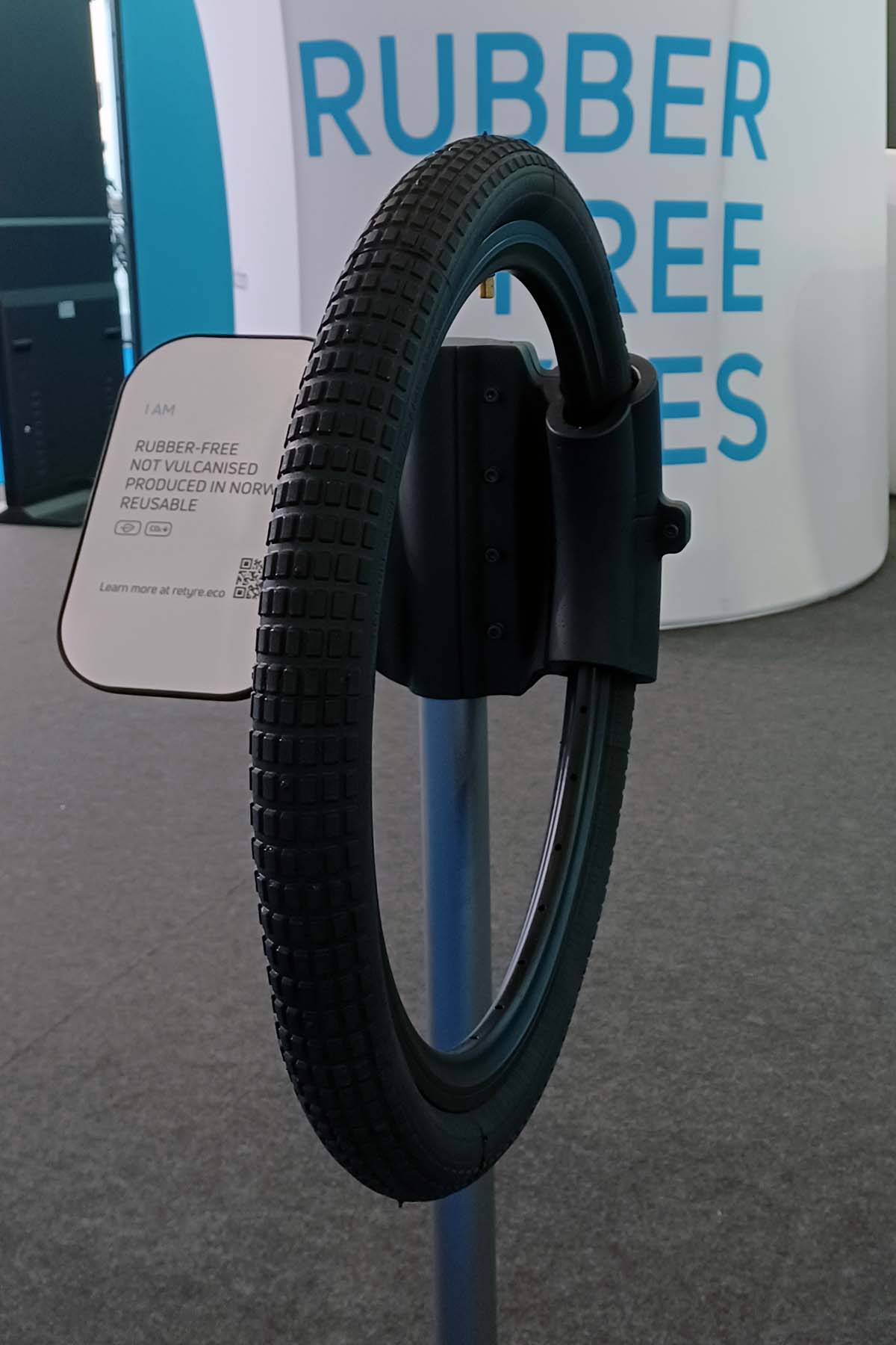Durch ein neuartiges Spritzgussverfahren von Retyre wird aus einem biobasierten Elastomer ein dem Gummi ähnliches Material. Dieses kann laut Hersteller Kautschuk weitgehend ersetzen, besteht aus nachwachsenden Rohstoffen, ist rezyklierbar und kann dank kompakter Produktion am Ort der Verwendung hergestellt werden.