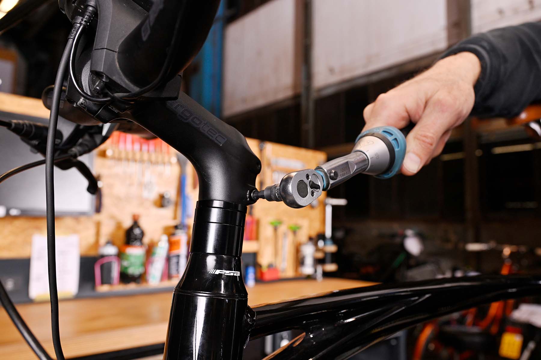 Dieser ist meist mit zwei Schrauben am Gabelschaftrohr geklemmt. Bei Rennvelos besteht das Gabelschaftrohr oft aus Carbon. Hier ist es besonders wichtig, dass die Schrauben dann nicht zu fest angezogen sind, da sonst die Gabel beschädigt werden könnte. Dazu hilft der Drehmomentschlüssel.
