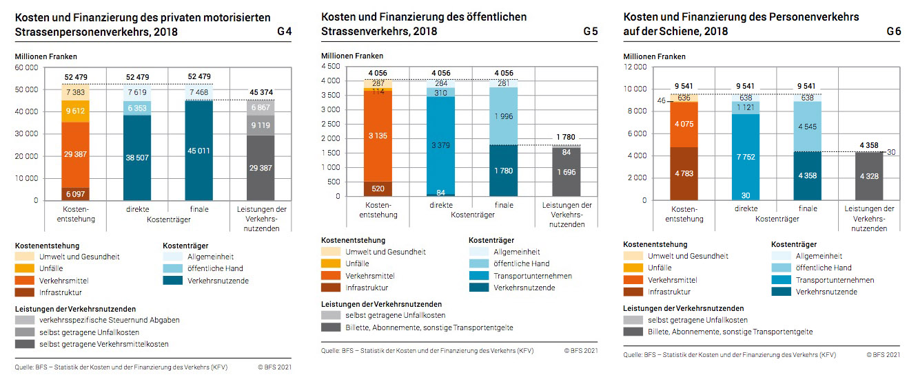 Die Fahrzeughalterinnen und -halter kommen gemäss Berechnungen des BFS für den grössten Teil dieser Kosten auf. Dennoch werden etwa 14 % beziehungsweise 7,5 Milliarden Franken wurden auf die Allgemeinheit abgewälzt.