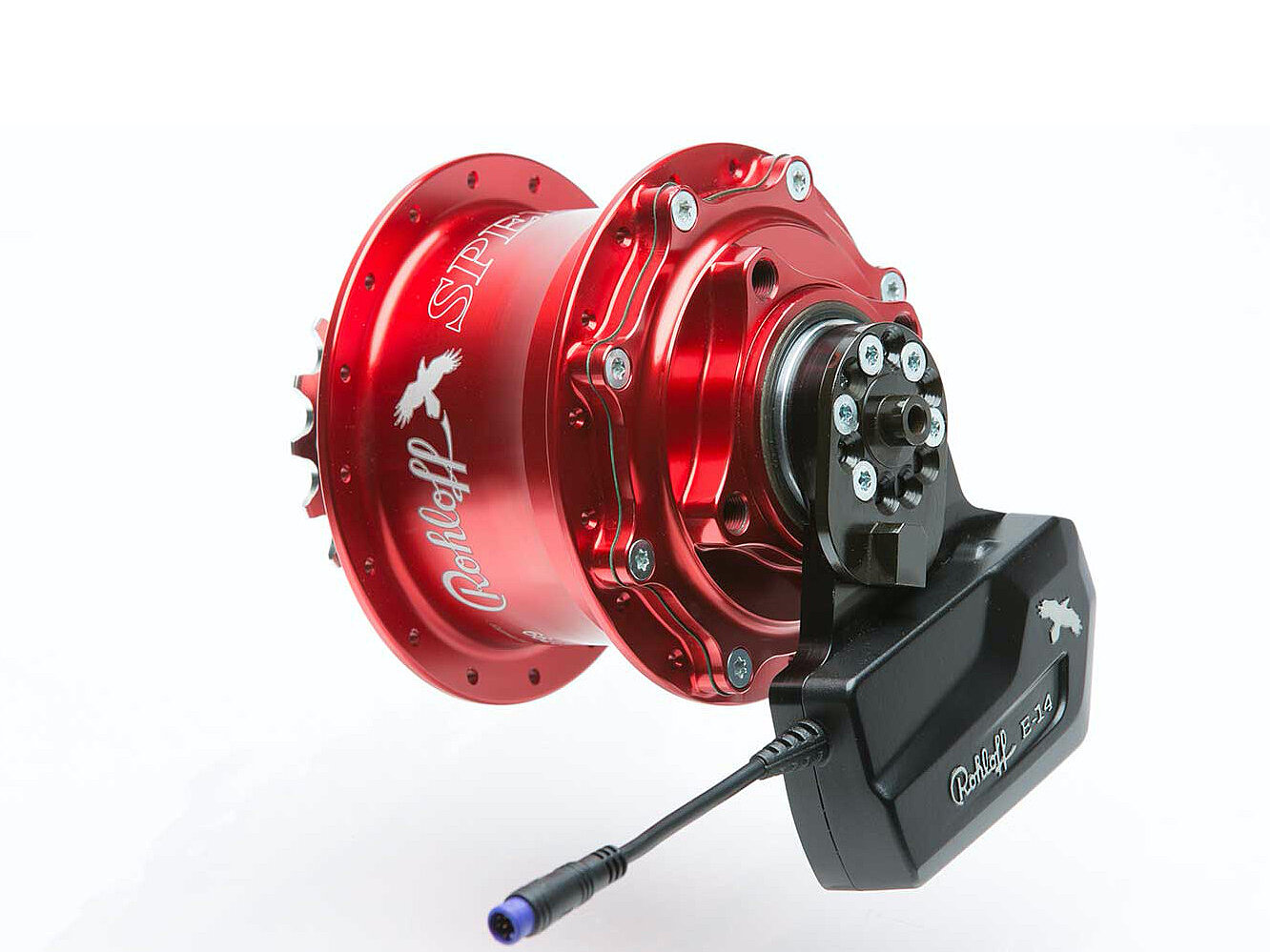 Da sie mit sehr wenig Wartung auskommt, ist die «Speedhub 500/14» von Rohloff unter Vielfahrern äusserst beliebt. Am E-Bike sorgte die Getriebenabe aber zunächst für Probleme: Da Gangwechsel unter Volllast nicht funktionieren, stellte das hohe Drehmoment der Hilfsantriebe ein echtes Problem dar. Für Abhilfe sorgte die 2017 lancierte «Speedhub E-14»: Bei dieser Variante werden Schaltmanöver nicht über den Drehgriff und gegenläufige Bowdenzüge ausgelöst, sondern auf Knopfdruck durch ein elektronisches Signal. Damit der Gangwechsel rasch und zuverlässig funktioniert, wird die Unterstützung vom Mittelmotor ganz kurz gedrosselt. Zudem lassen sich auch drei Gänge aufs Mal schalten, wenn man den Knopf gedrückt hält.