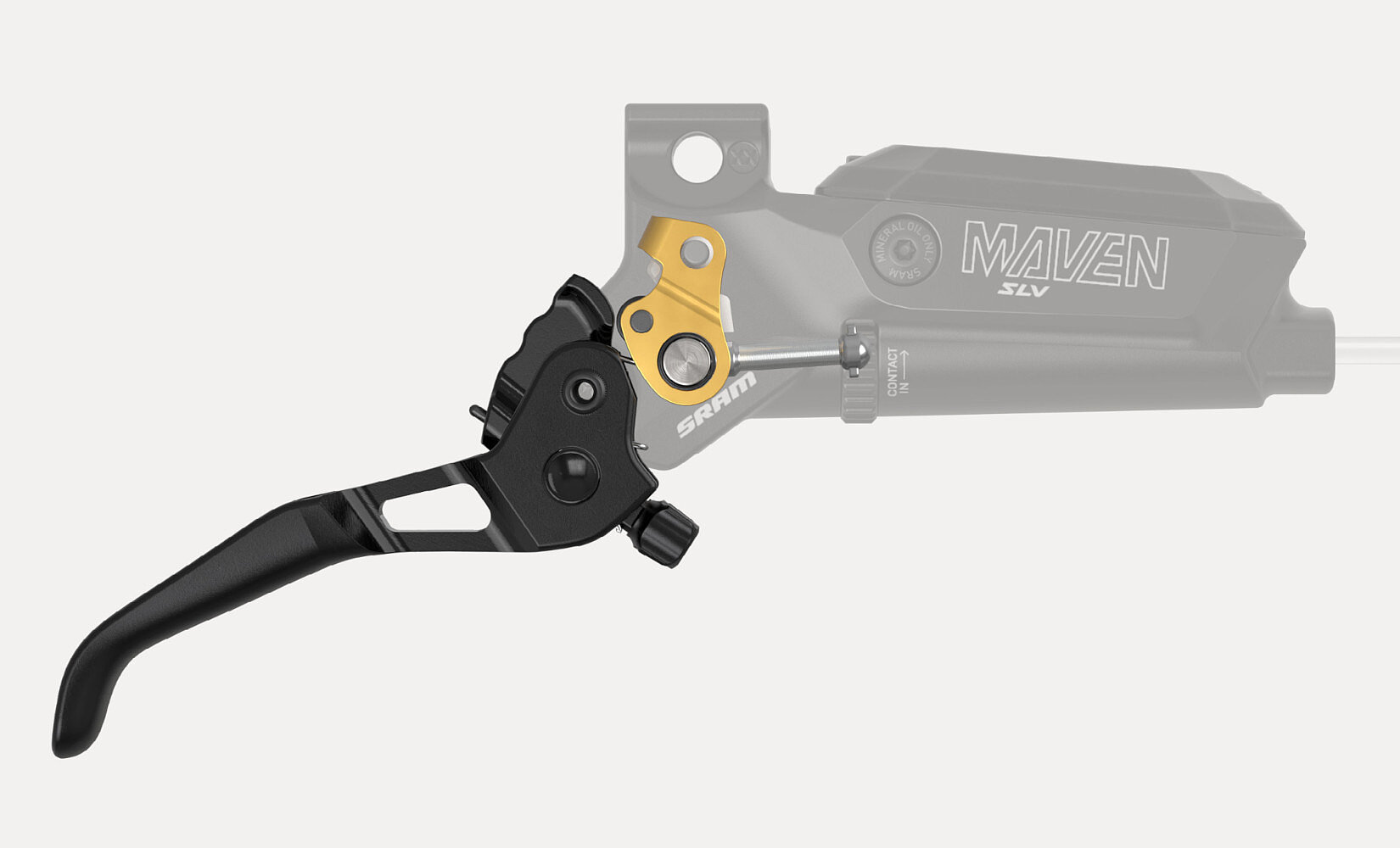 Die kaum erkennbare, aber eigentlich noch wichtigere Neuerung versteckt sich im Bremshebel – oder genauer, zwischen dem Hebel und dem Geberzylinder. Letzterer wird neu über ein Swing Link angesteuert, das in den Varianten «progressiv» (gold) und «sehr progressiv» (rot) angeboten wird und sich auch an «Maven»-Bremsen der ersten Generation nachrüsten lässt.