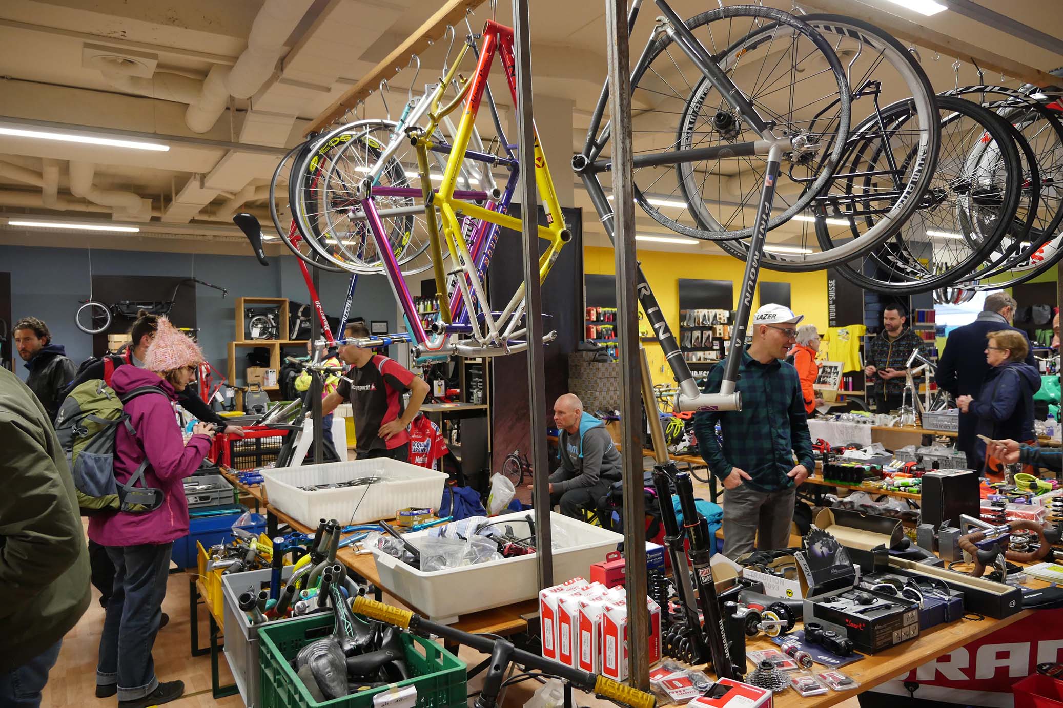 Mit der sechsten Ausgabe hat der Luzerner Veloteile-Flohmarkt bereits Tradition. Auf den Verkaufstischen liegen nicht nur Schnäppchen, sondern jeweils auch einige Jahre Velogeschichte: Vom alten Kettenschutz und Ledersattel über erste Titan-Teile aus den 70er-Jahren, Mountainbike-Komponenten aus der Pionierzeit bis hin zu Federgabeln, Kleidern und Schuhen aus dem Vorjahr, welche zu Schnäppchenpreisen verkauft wurden.