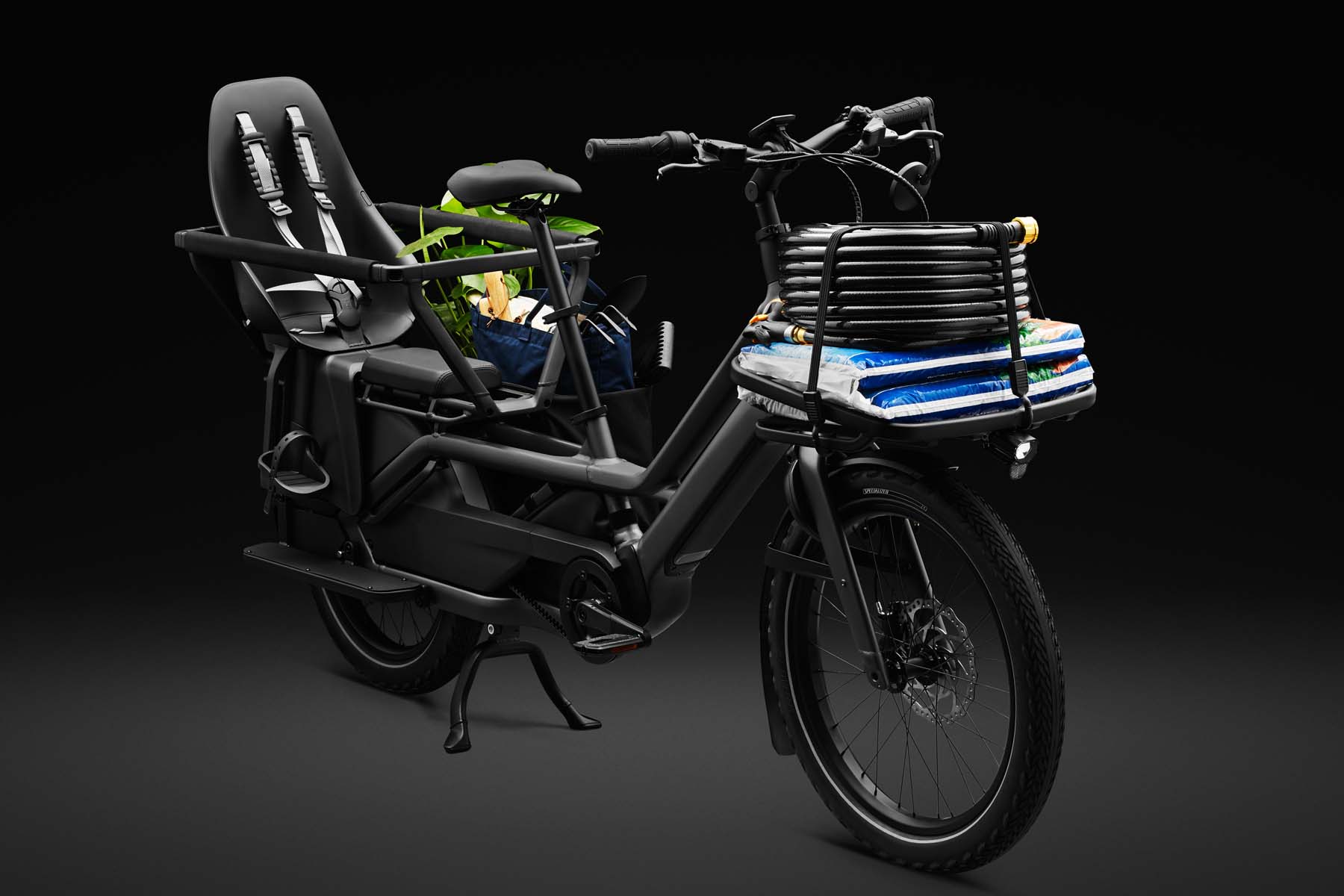 Auf dem langen Heckgepäckträger können bis zu zwei Kinder in Kindersitzen (kompatibel mit dem MIK-HD-System) oder 60 kg Zuladung transportiert werden. Der robuste Frontgepäckträger nimmt bis zu 20 kg schwere Einkäufe mit.