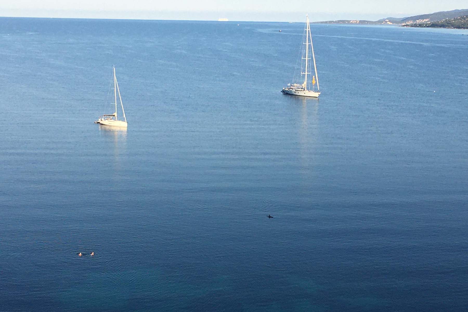 Am nächsten Morgen werden wir beim Morgenschwumm von zwei Delphinen in sicherer Distanz begleitet – und merken es nicht einmal. Kollege Claudio hat es aber beobachtet und fotografisch festgehalten.